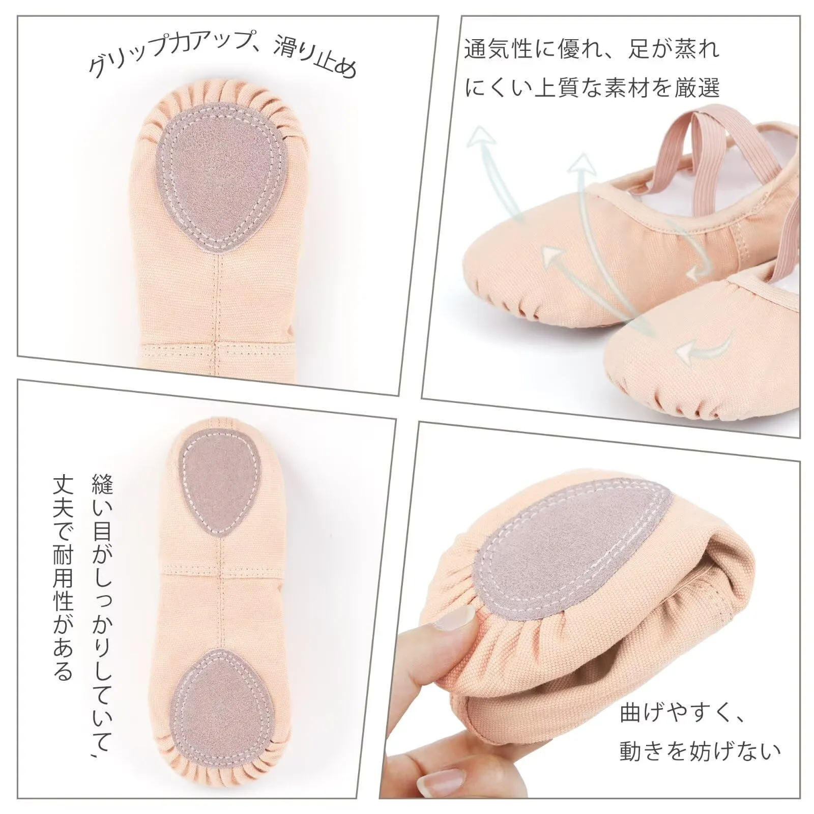 「材質」外側は丈夫なズック材質、内側は綿素材なので肌あたりもソフト快適に履くことが出来ます。しっかりフィットし、歩きやすいです。耐久性と通気性に優れた材質を選んで製作され、とても踊りやすい。甲部分のゴムは始めから縫い付けてありますので、縫う手間いらず。耐久性に優れた柔らかで足なじみのよいバレエシューズです♪