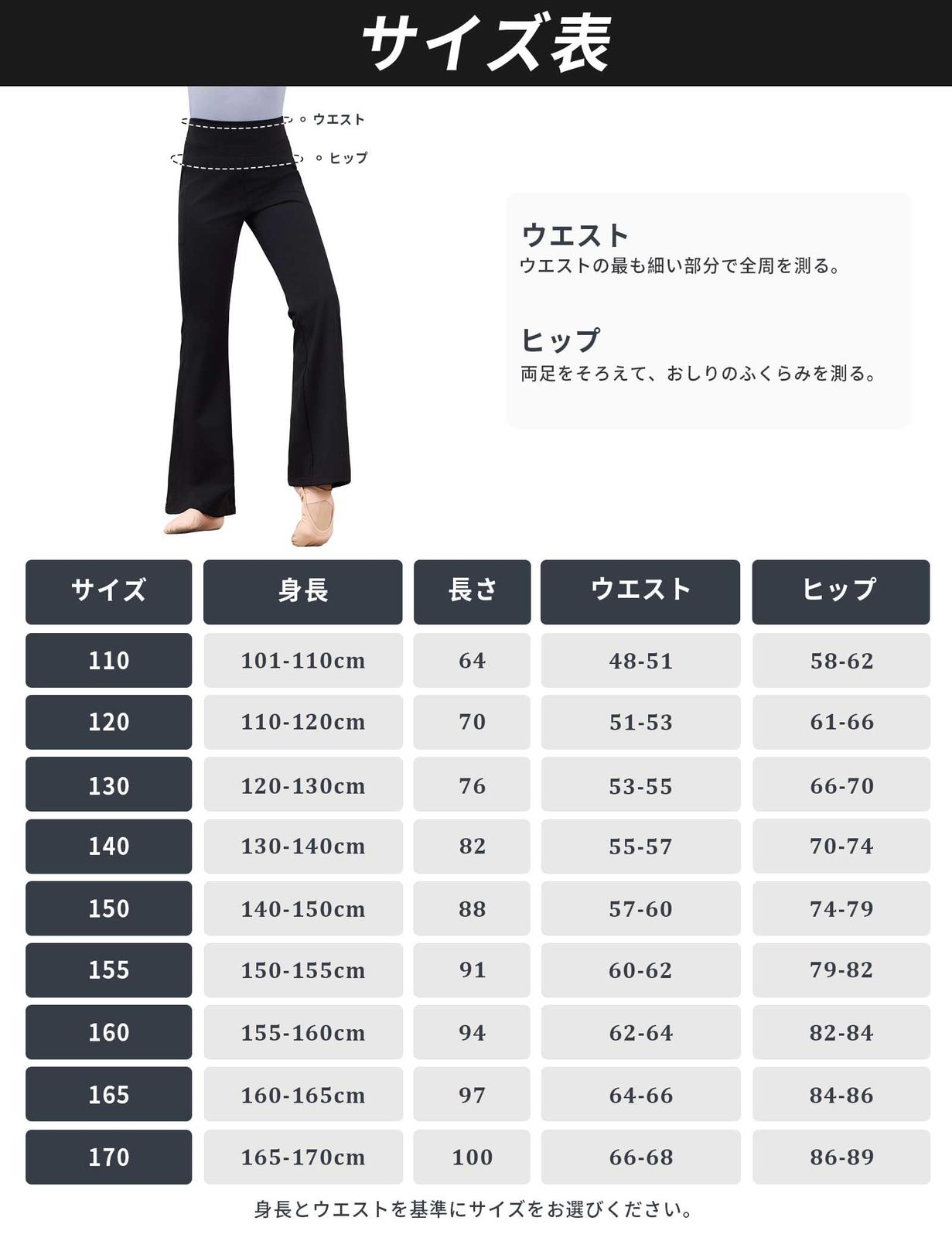 サイズ:110高さ100-110cm、120高さ110-120cm、130高さ120-130cm、140高さ130-140cm、150高さ140-150cm、155高さ150-155cm、160高さ155-160cm、165高さ160-165cm、170高さ165-170cm。