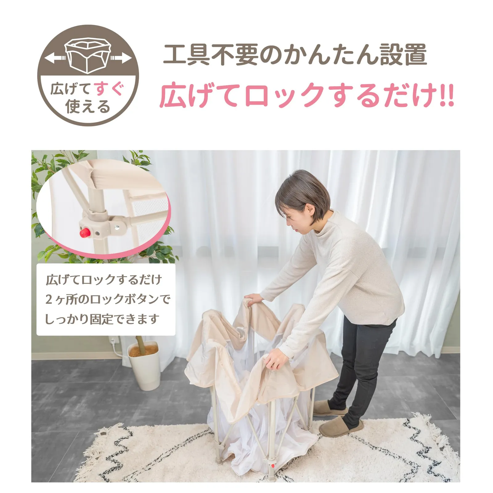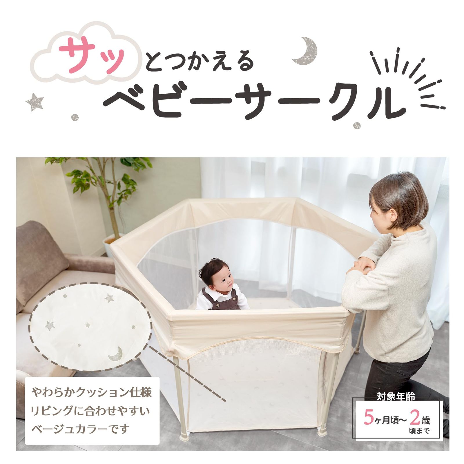 工具不要でサッと広げてすぐに使えるベビーサークルです。底面はやわらかクッション仕様でリビング合わせやすいベージュカラーです。
