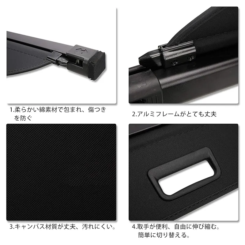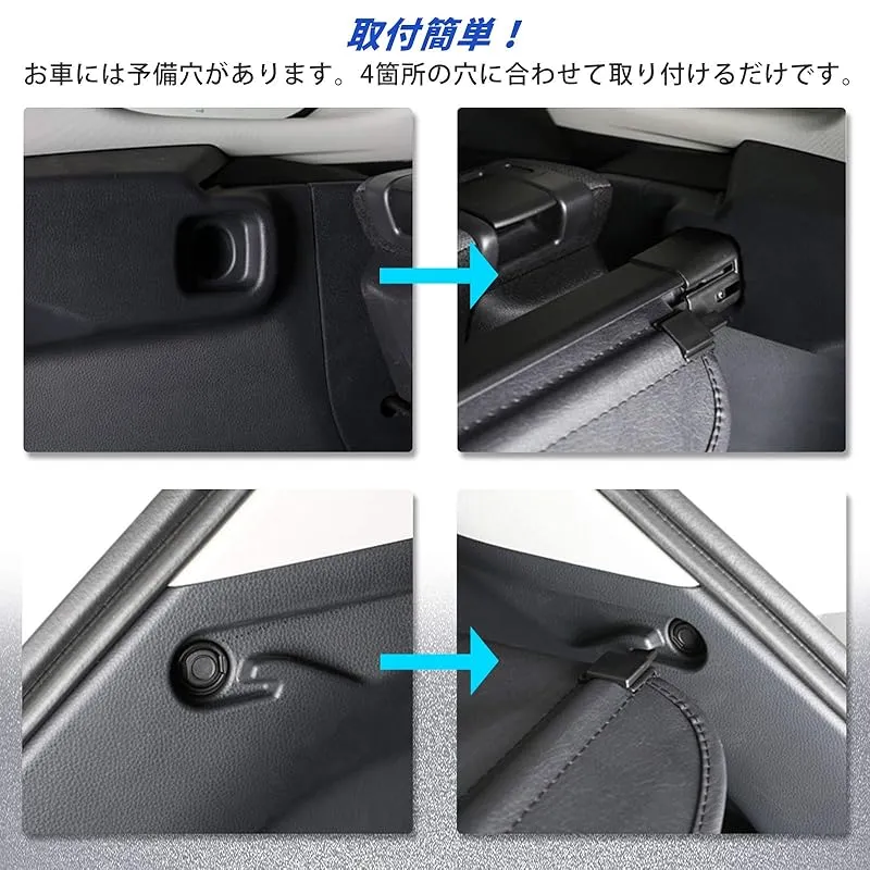 【取り付け簡単】お車には予備穴があります。トノカバーの両端を予備穴に合わせて簡単に取り付けできます。加工する必要がありません。普段は自由に伸び縮み、使簡単に切り替えます。トノカバー手前にグリップを設置し、大人でも子供でも簡単にトノカバーを引き出すことができます。