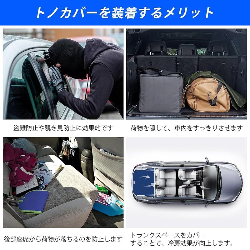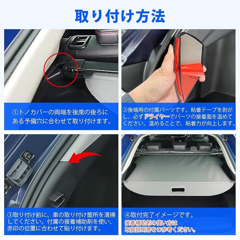 【取り付け簡単】トノカバーの両端を後席の後ろにある予備穴に合わせて取り付けます。後端用の付属パーツを車の指定位置に合わせて貼り付けます。加工する必要がありません。日本語取扱説明書が付属しており、ご参考ください。