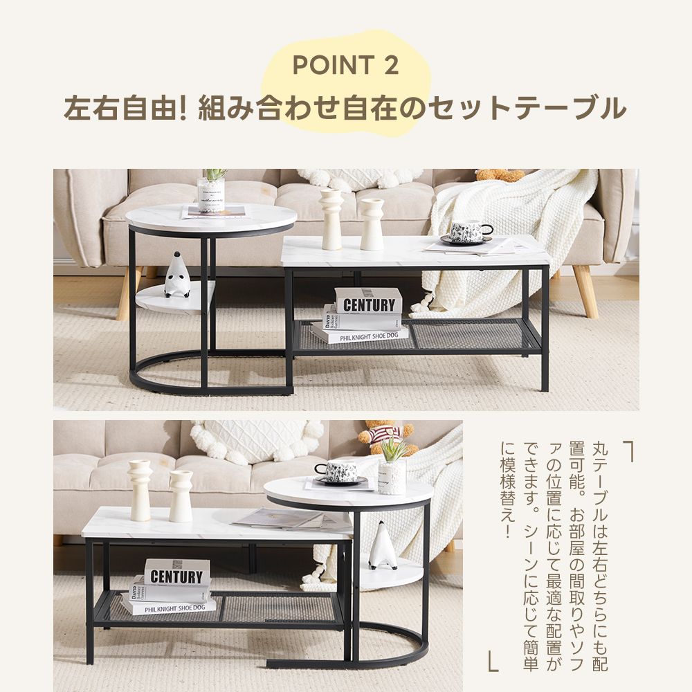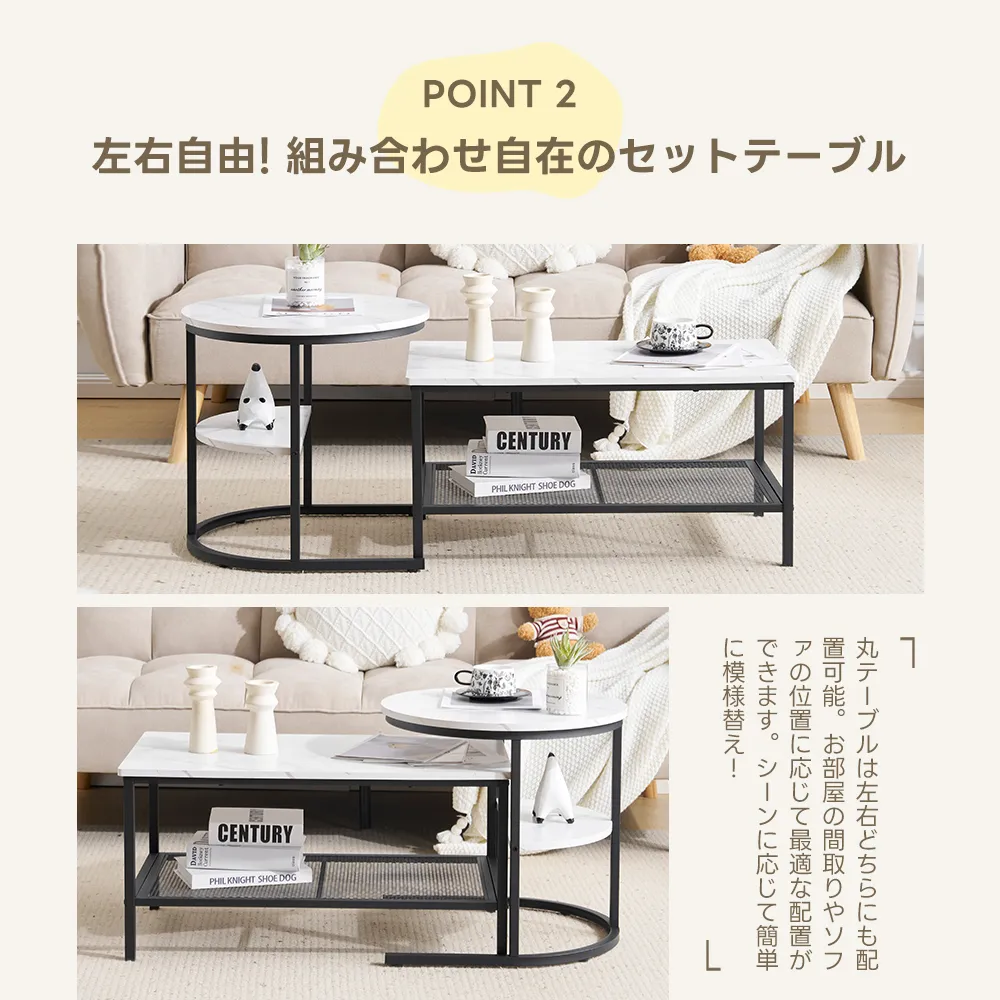 【左右自由!組み合わせ自在のセットテーブル】丸テーブルは左右どちらにも配置可能。お部屋の間取りやソファの位置に応じて最適な配置ができます。シーンに応じて簡単に模様替え!