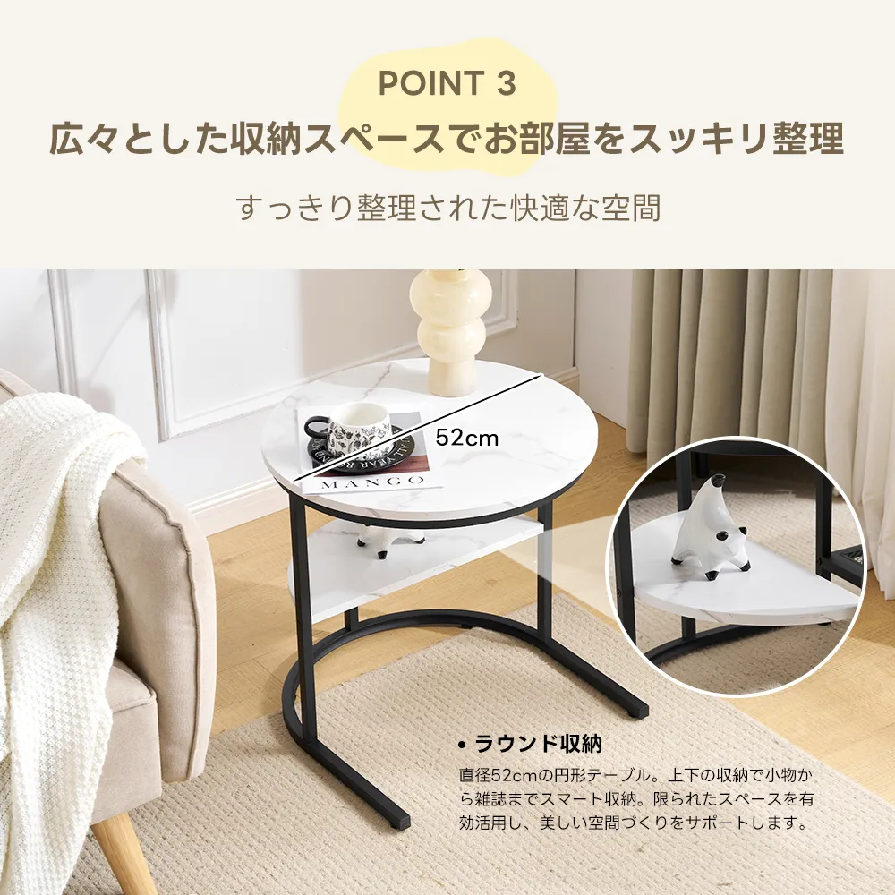 【多機能サイドテーブル:一台で何役も!】円形のサイドテーブルは、ソファ横のサイドテーブル、ベッドサイド、ダイニング横のサブテーブルとしても使える万能型。小回りが利くから、お部屋のどこでもフィット。
