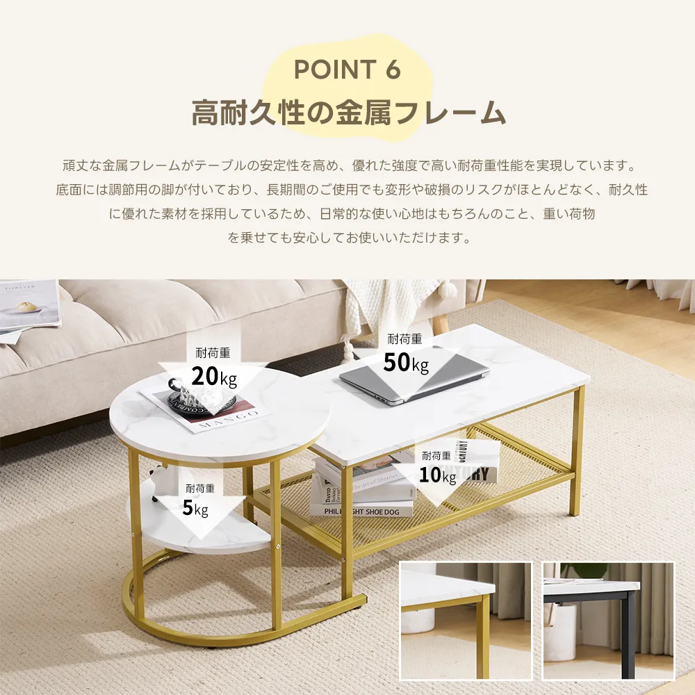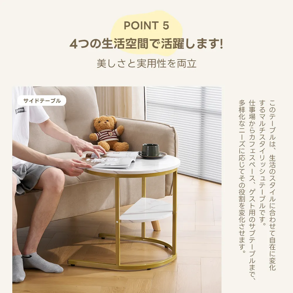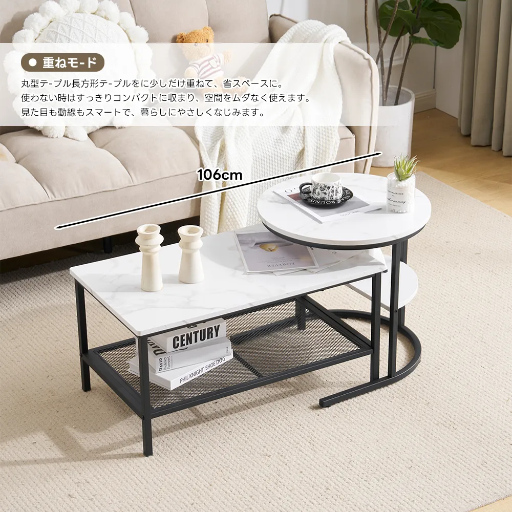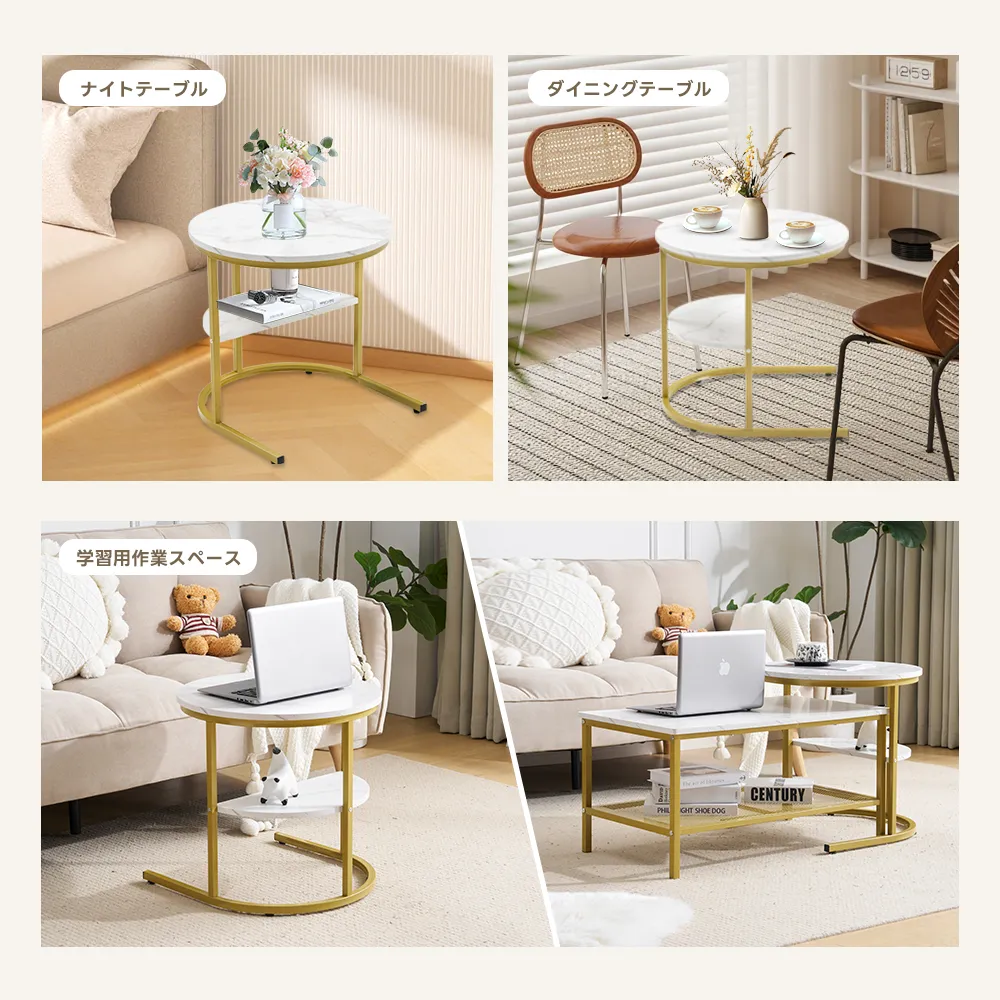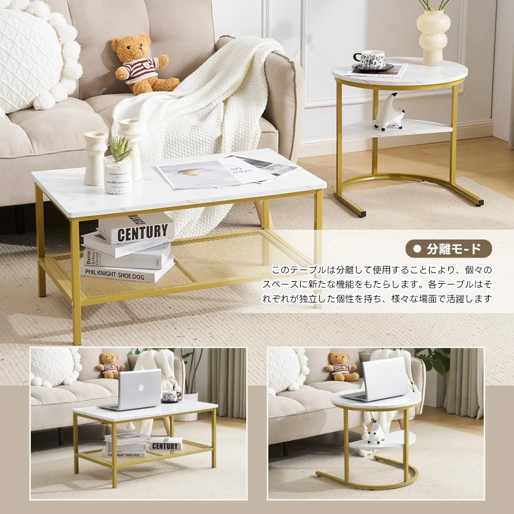 【3WAY使用でシーンに応じて大活躍!】長方形テーブル単体、丸型サイドテーブル単体、重ねて使うセットスタイルの3通りに対応。作業・来客・ティータイムなど、暮らしに合わせて自由に切り替え可能!高級感のある大理石風天板と、北欧テイストのゴールド脚がモダンな空間を演出。収納棚付きで実用性も抜群です。
