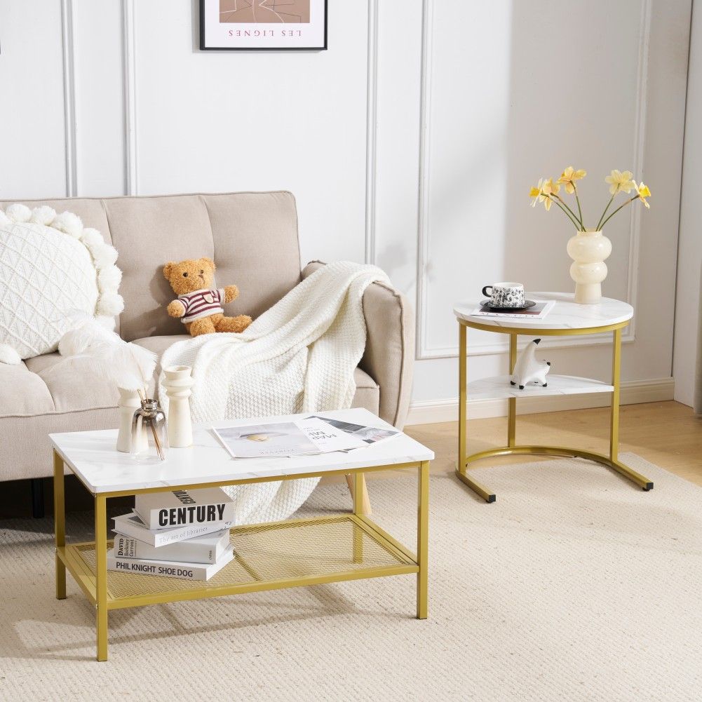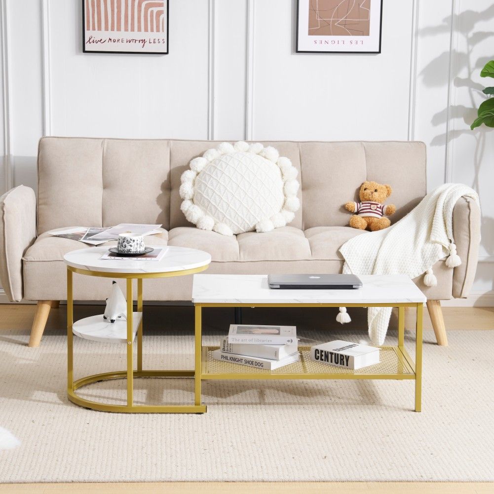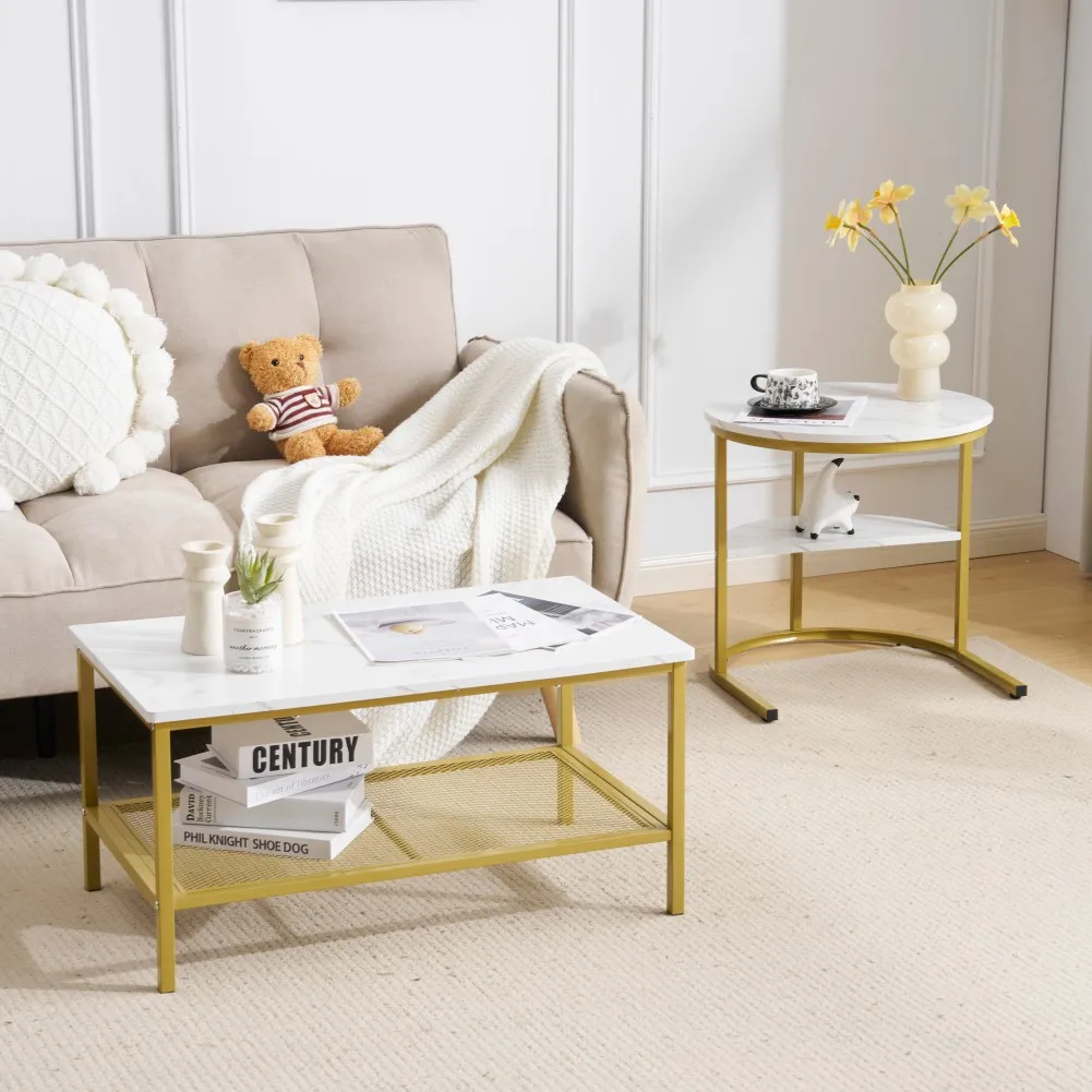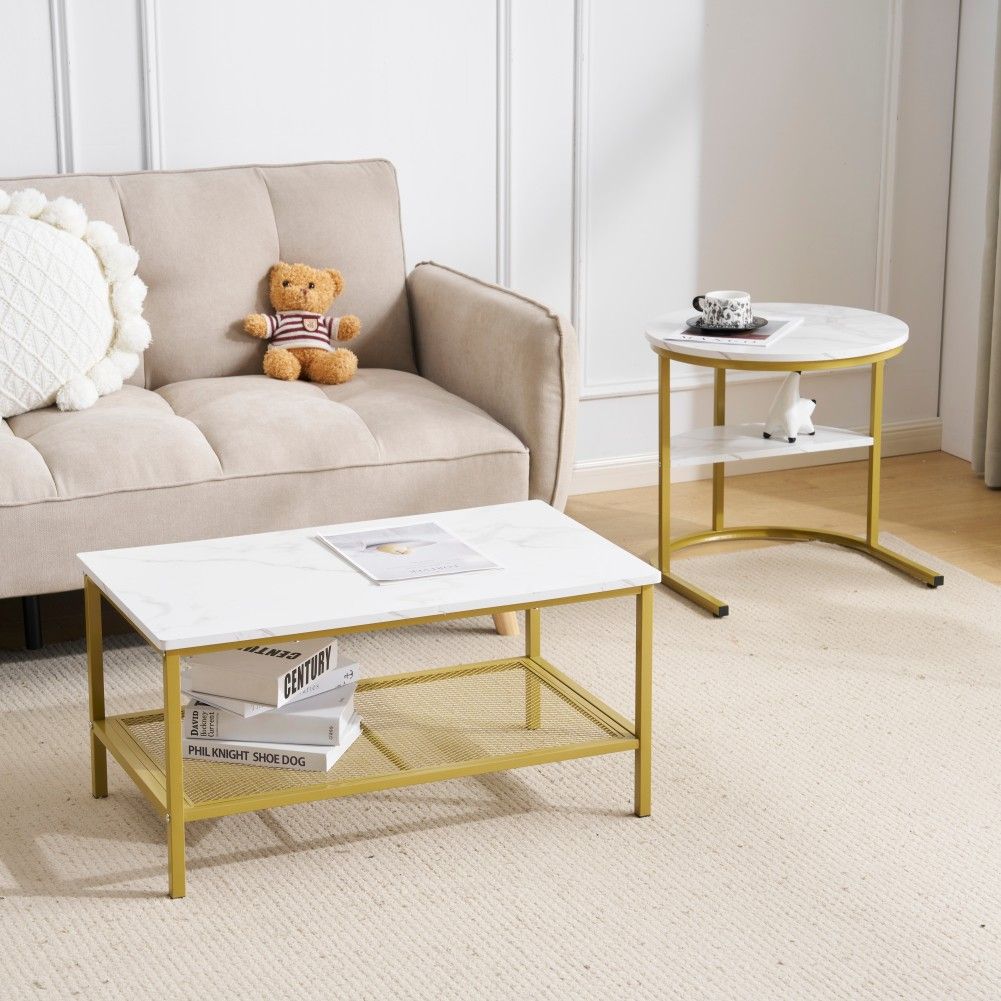 【3WAY使用でシーンに応じて大活躍!】長方形テーブル単体、丸型サイドテーブル単体、重ねて使うセットスタイルの3通りに対応。作業・来客・ティータイムなど、暮らしに合わせて自由に切り替え可能!高級感のある大理石風天板と、北欧テイストのゴールド脚がモダンな空間を演出。収納棚付きで実用性も抜群です。