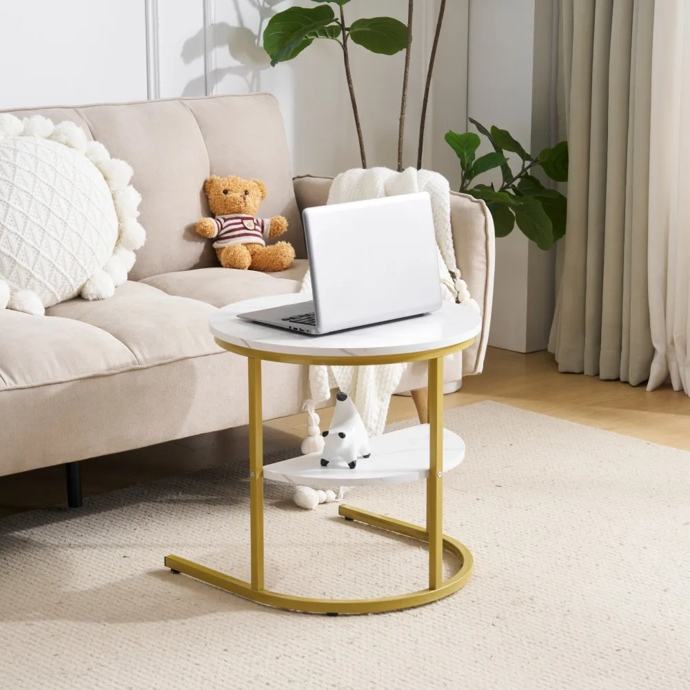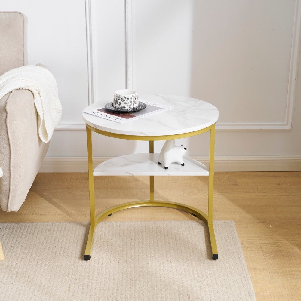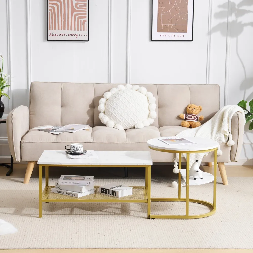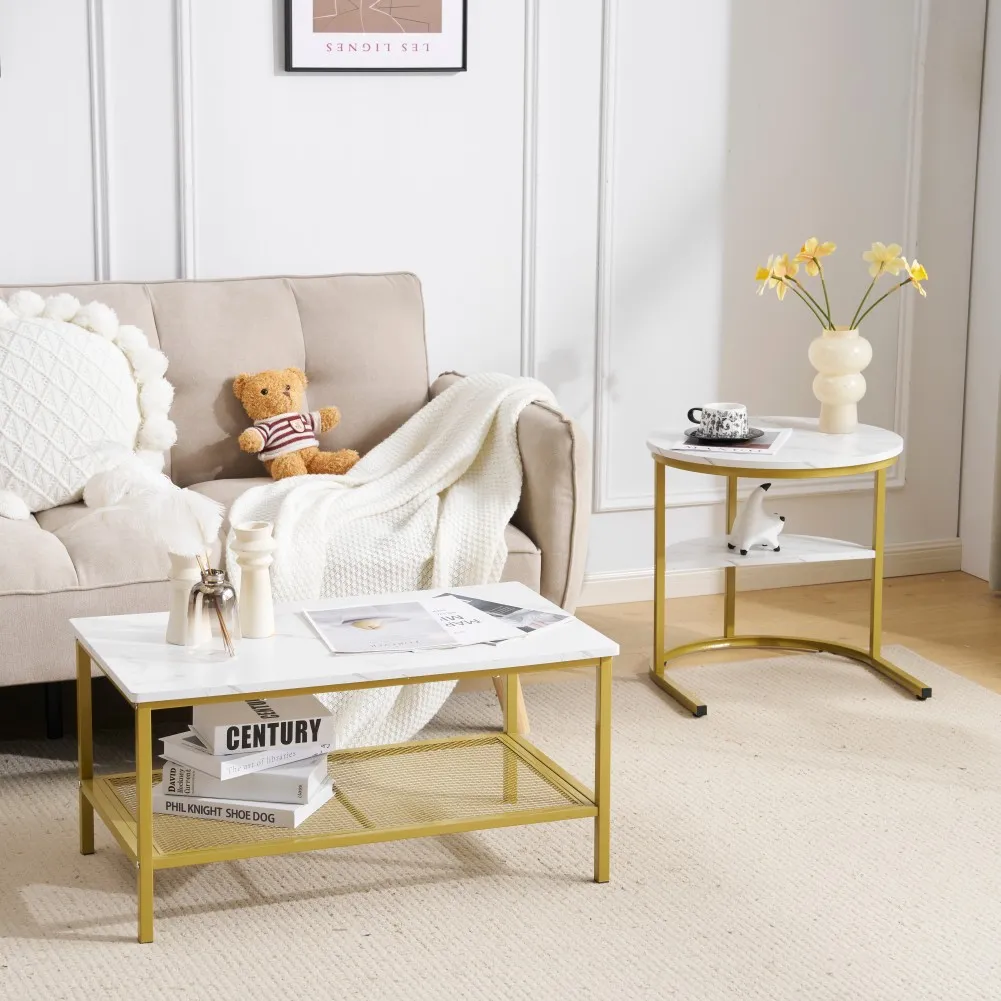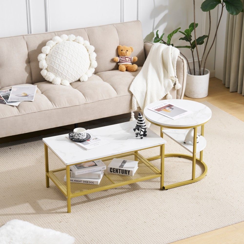 【3WAY使用でシーンに応じて大活躍!】長方形テーブル単体、丸型サイドテーブル単体、重ねて使うセットスタイルの3通りに対応。作業・来客・ティータイムなど、暮らしに合わせて自由に切り替え可能!高級感のある大理石風天板と、北欧テイストのゴールド脚がモダンな空間を演出。収納棚付きで実用性も抜群です。