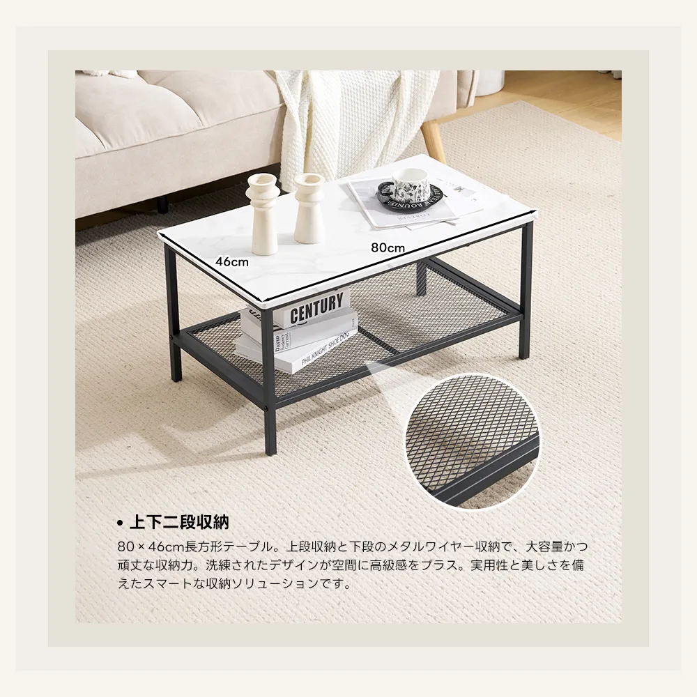 【収納スペースたっぷり!すっきり片付く】メッシュラック付きの長方形テーブル+2段構造の丸テーブルで計3か所の収納空間を確保。雑誌・リモコン・ティッシュなど日常小物をスマートに整理整頓。