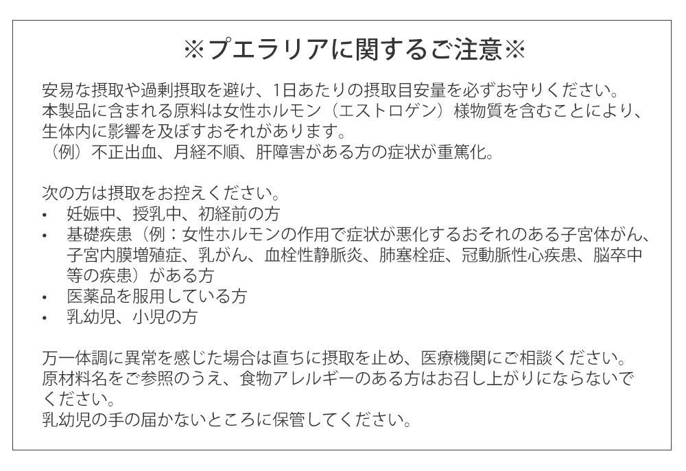 ●プエラリア・ミリフィカは、女性ホルモン(エストロゲン)様物質を含むため、生体内に影響を及ぼすおそれがあります(不正出血、月経不順等)。また、肝障害がある方の症状が重篤化するおそれがあります。