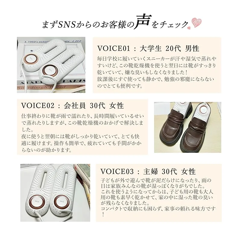 【30dBの静音設計、夜間でも快適】 ?? ?? **運転音わずか30dB(ささやき声レベル)**で、夜間使用も安心。家族の睡眠を邪魔せず、朝にはポカポカの靴を履ける! ??