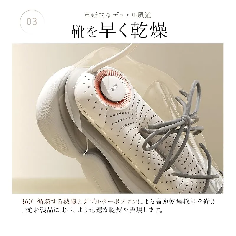 【デュアルチャンネルで熱風倍増!】 ?? ?? 従来のシングル送風よりも2倍のパワー! 革新的なデュアル設計で熱風を360°均一に循環させ、靴の隅々まで素早く乾燥。寒い朝も、もう濡れた靴で悩まない!?