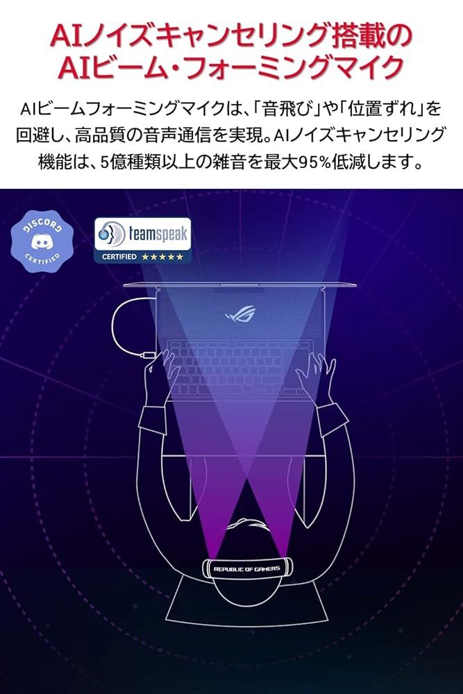 AIノイズキャンセリング機能付きAIビームフォーミングマイクが卓越した収音と約5億種類の周囲の雑音を低減し、ゲーム中でのクリアな音声通信を実現