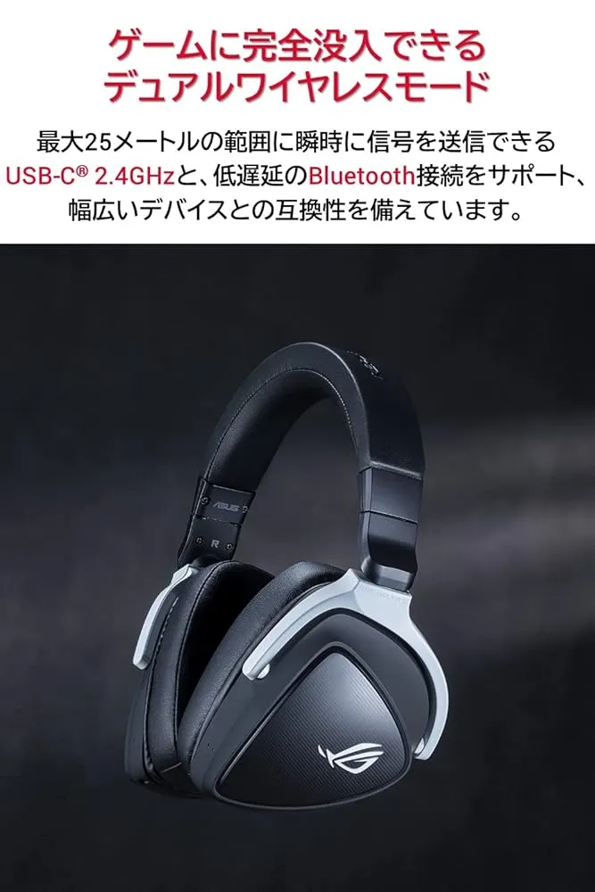 付属品 : ユーザーガイドROGハイブリッドイヤークッションUSB-C-USB2.0アダプター 「主な仕様」使い方自由自在:低遅延2.4GHzとBluetoothによるデュアルモードワイヤレス接続対応