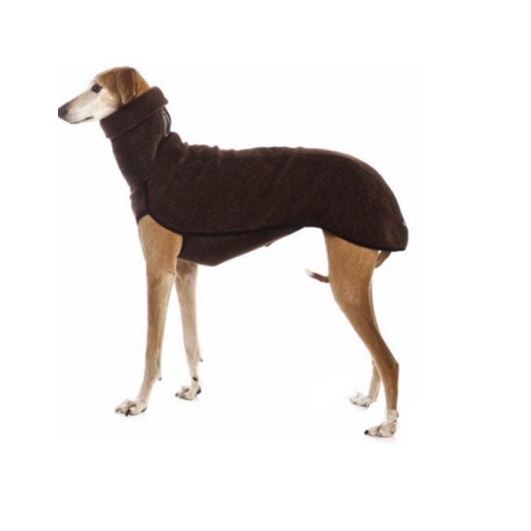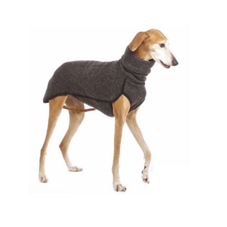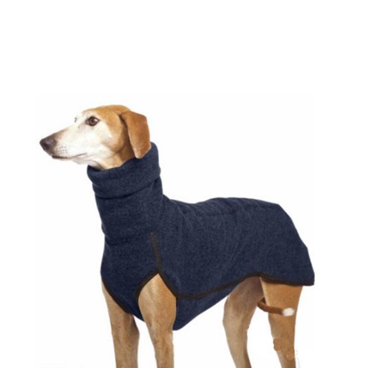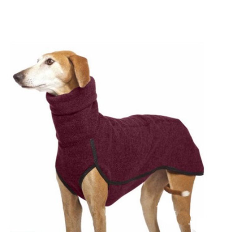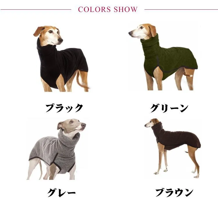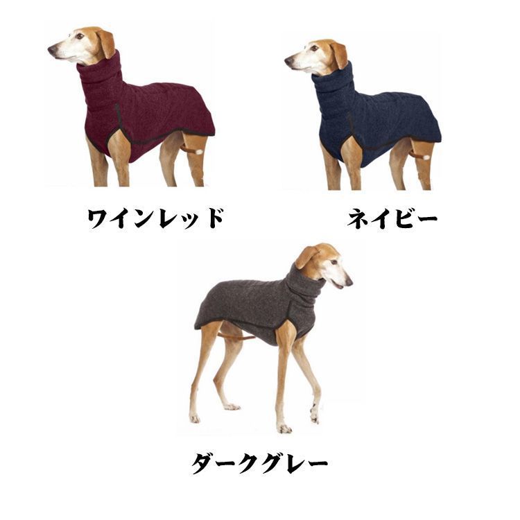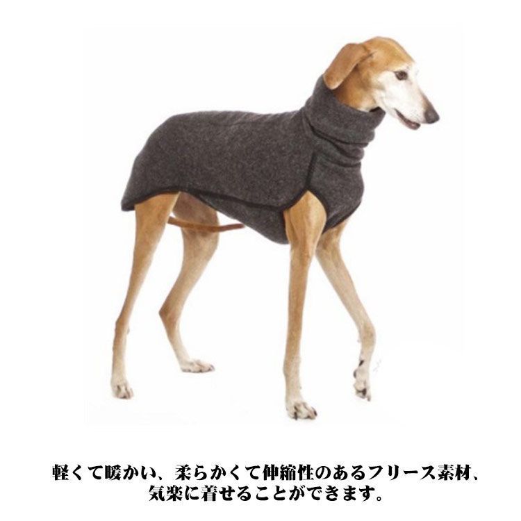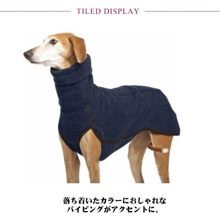 フリース素材を使用し、頭まですっぽり覆えるタートルネック犬服。