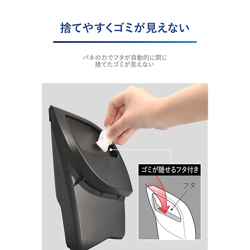 ●中身が見えない自動で閉まるフタ フタを本体の内側に押し込んでゴミを捨てます。フロントのフタにはバネが入っているので、ゴミを捨てて手を離すと自動でフタが閉じます。 本体内部のゴミを捨てる際は、背面のカバーを取り外してゴミを捨てることができます。