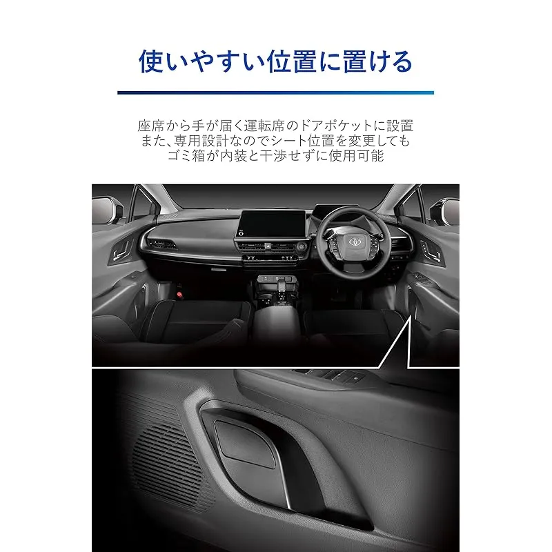 プリウス専用設計のためドアポケットにぴったり収まります。専用設計のため、シートの位置を変更してもゴミ箱とシートが干渉しません。