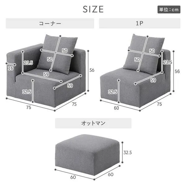 コーナー:幅75×奥行75×高さ56cm(クッションを含んだ高さ:78cm)