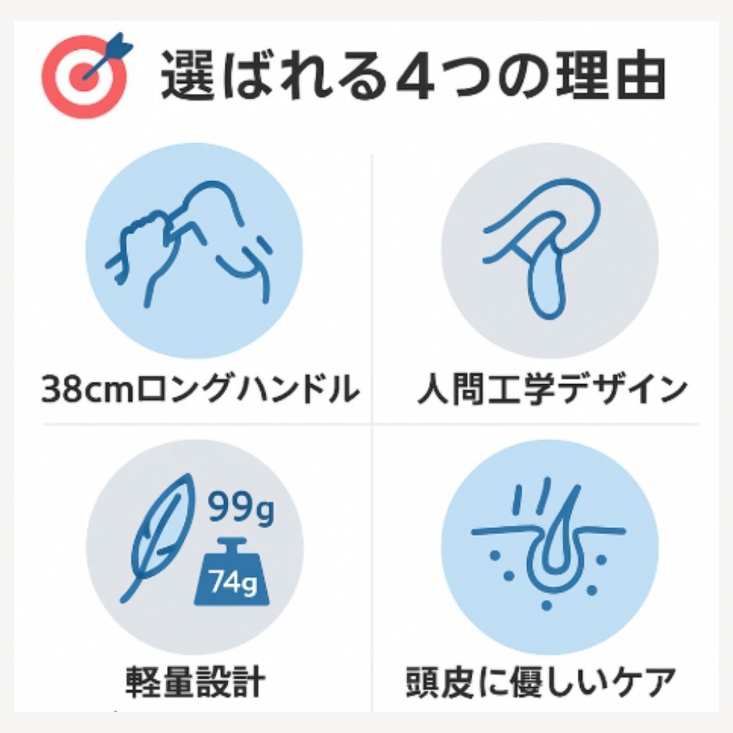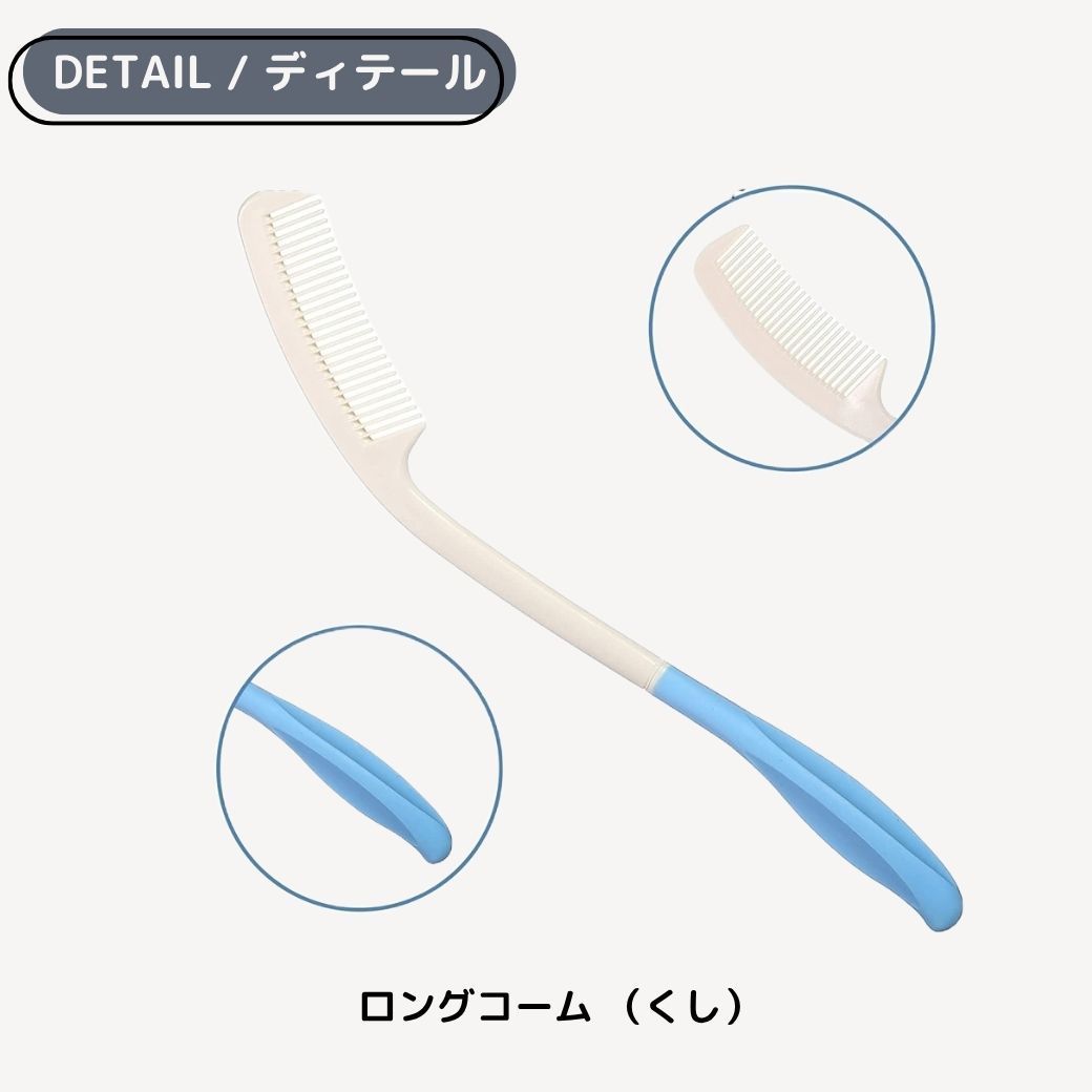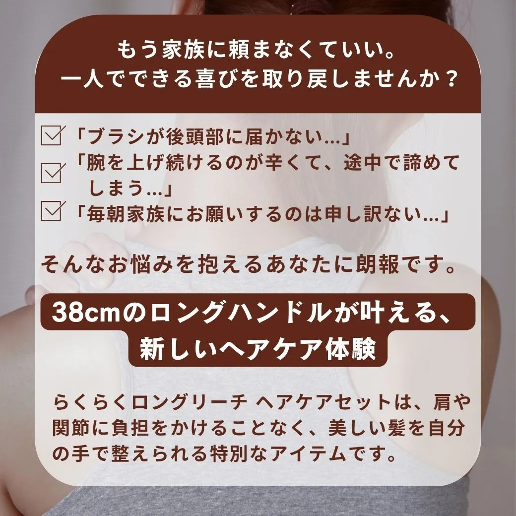 年齢や体調に関係なく、誰でも手軽にヘアケアができるように工夫されたこのセット。特に高齢者や関節痛のある方に喜ばれるアイテムです!