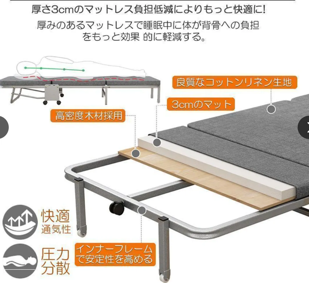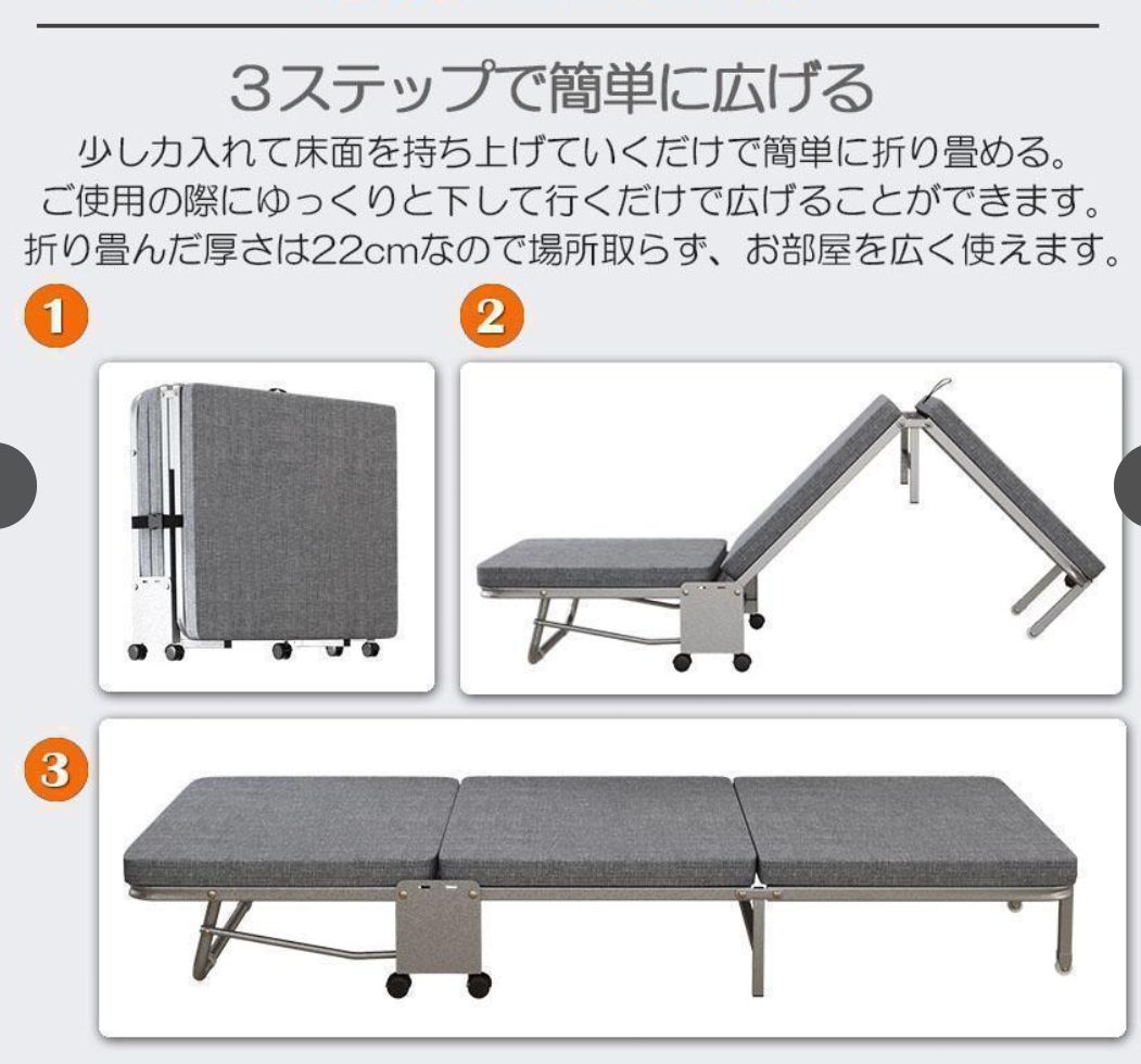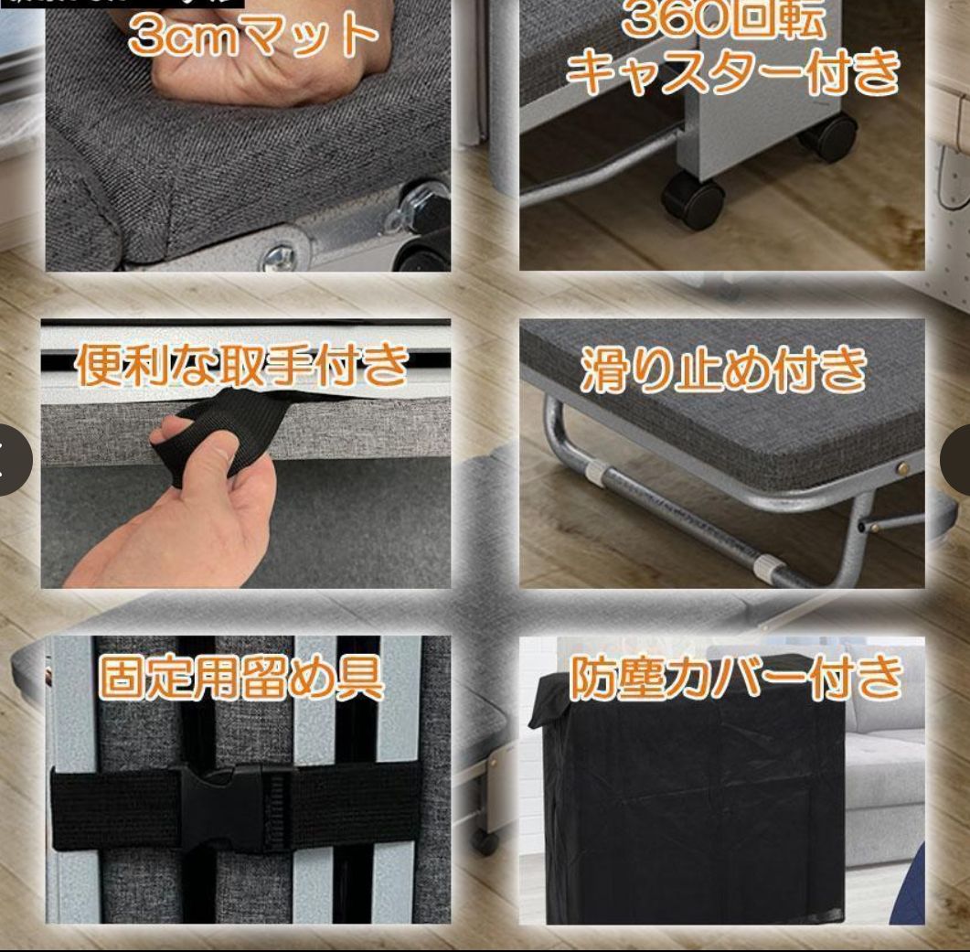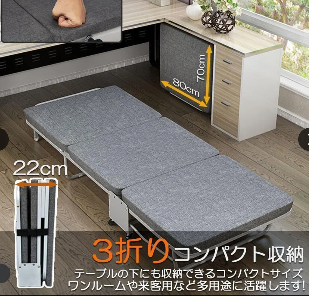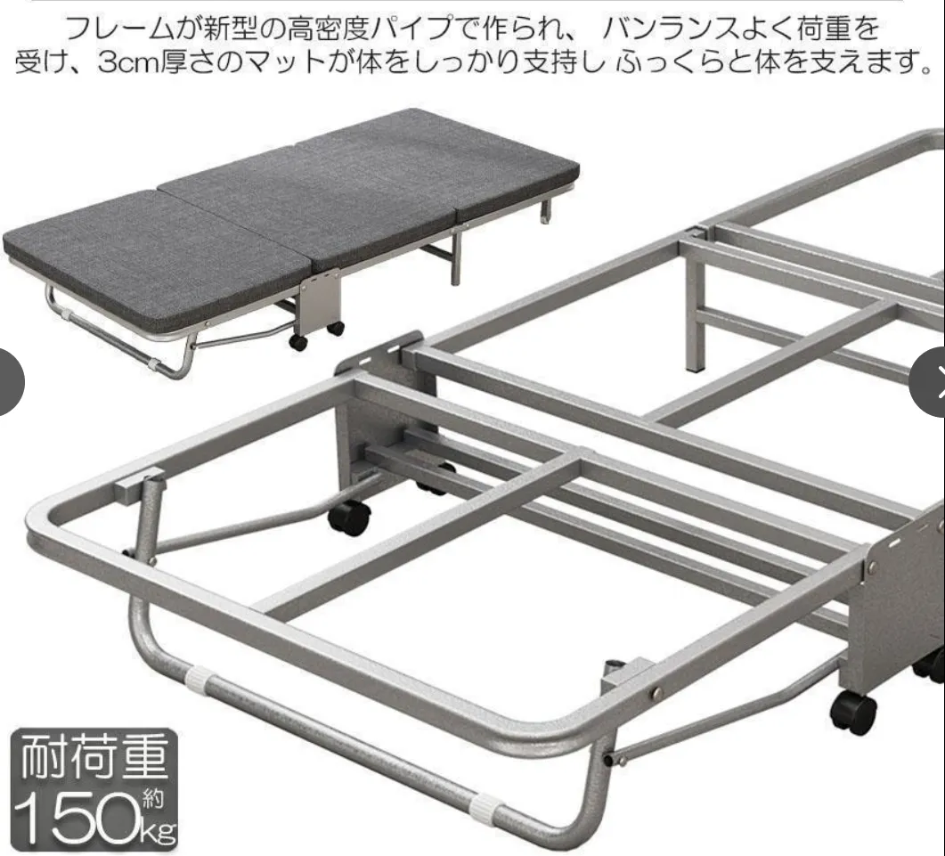 【多機能用ベッド】コンパクトに折り畳めし、キャスターで簡単に移動できるし、来客用としてや病院介護用或いはオフィス昼寝用非常に便利です。