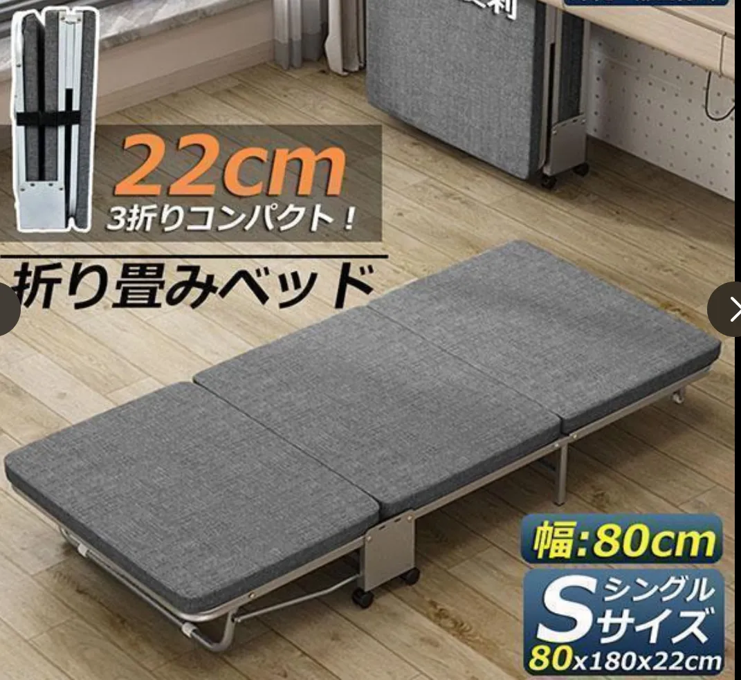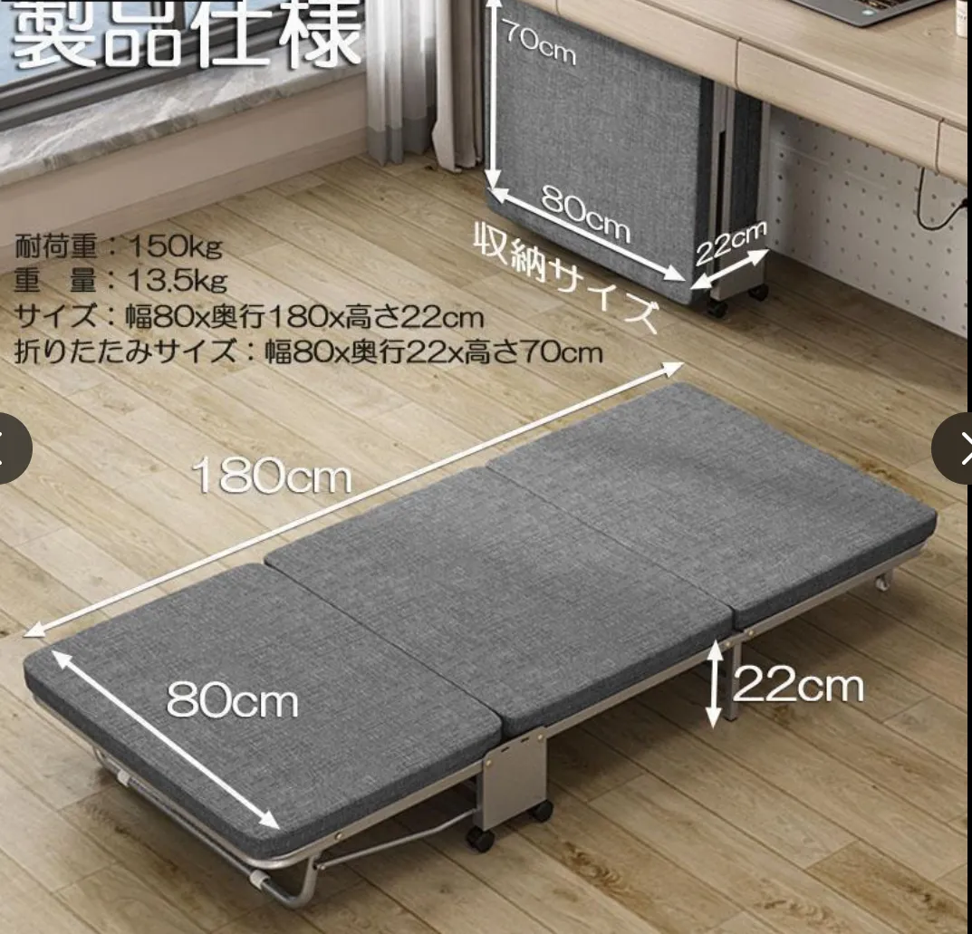 【商品情報】商品サイズ:長180CMx幅80CMx高さ22CM。折畳みサイズ:幅80CMx奥行22CM*高70CM。パイプ:スチール。マット:スポンジ、不織布、合板。耐荷重:約150kg。重量:約13.5kg。
