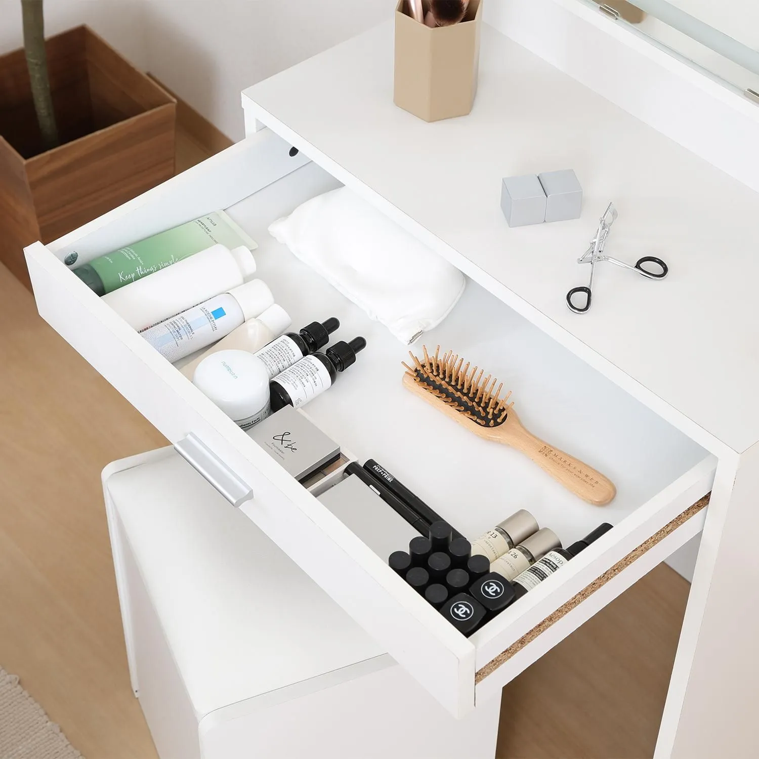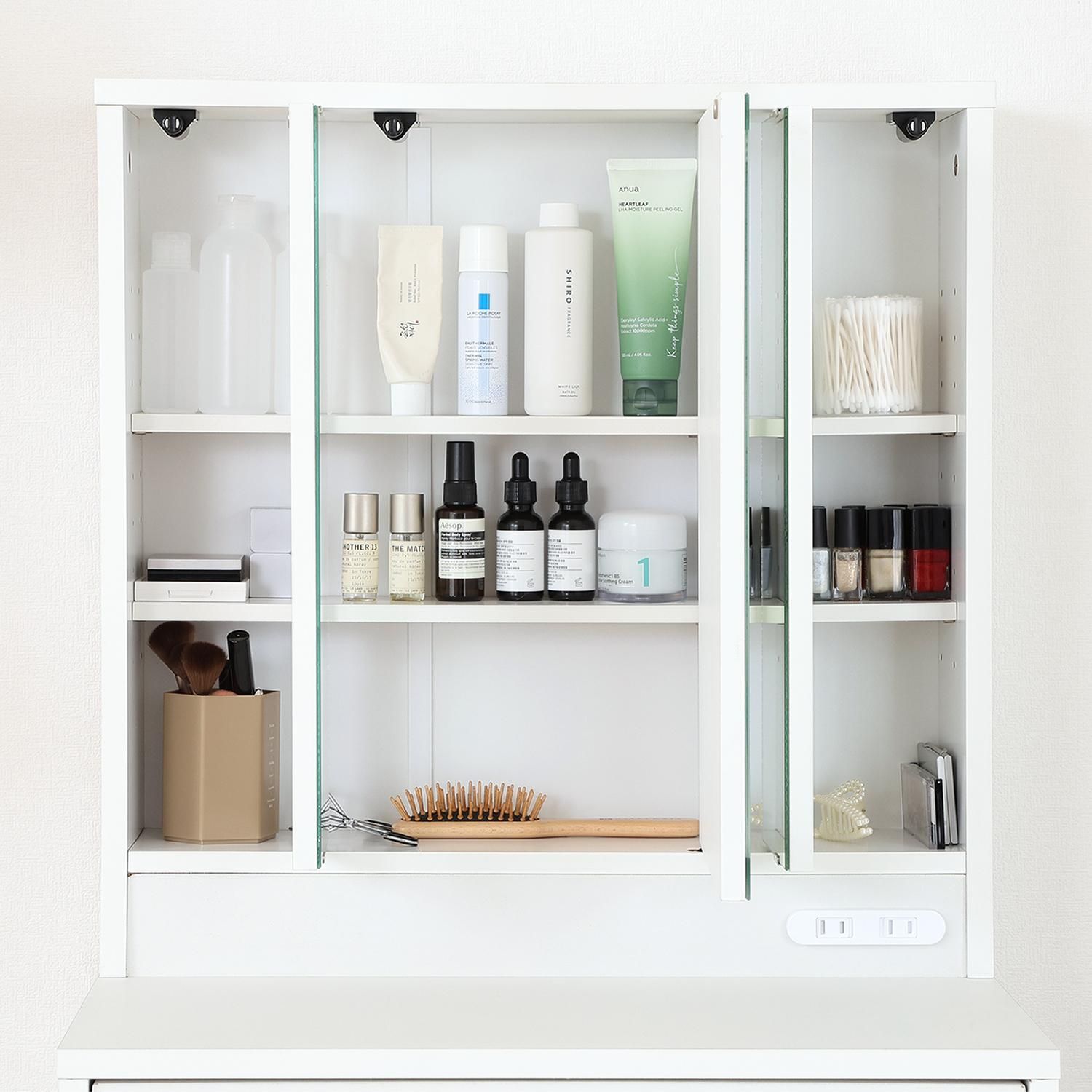ミラー裏には高さ調節できる棚板収納スペースがあり、幅広い引き出し収納もついているので、多くの小物を整理しておくことができます。