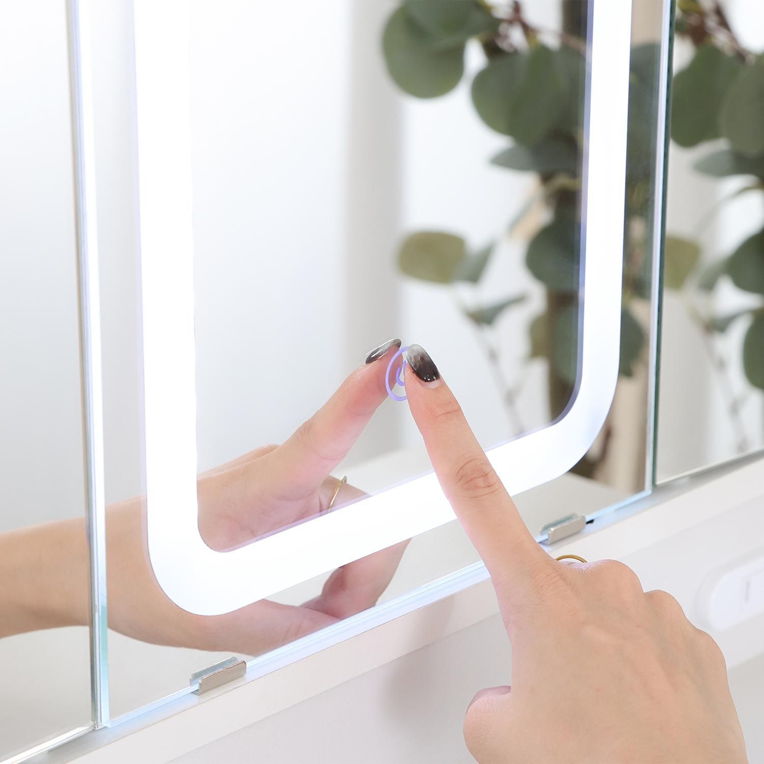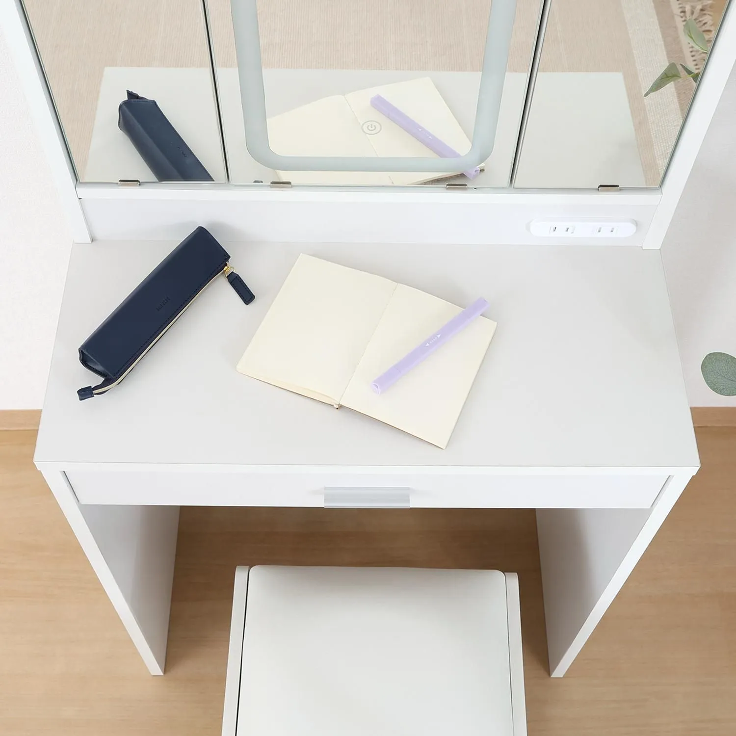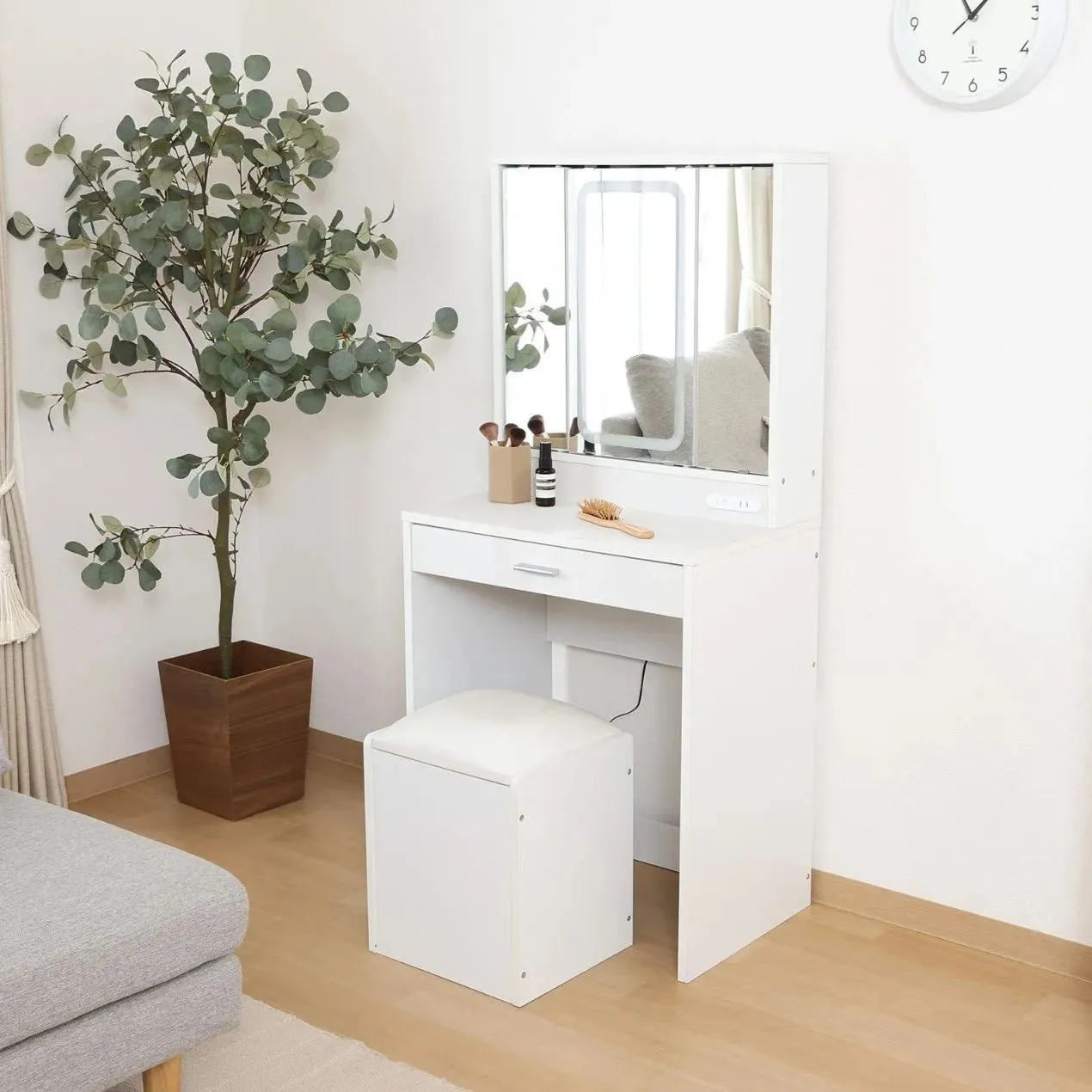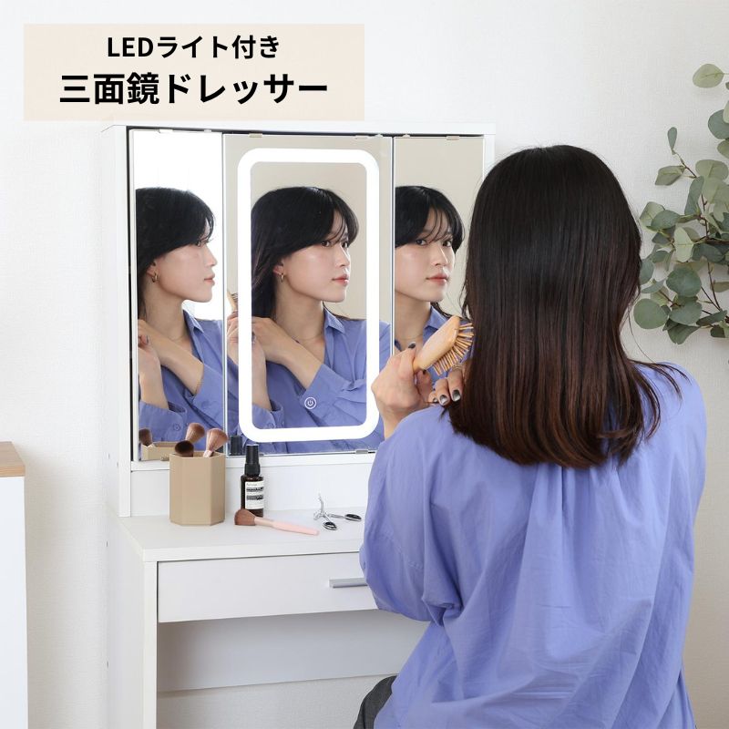 LEDライトがついた三面鏡のシンプルなデザインのドレッサーです。