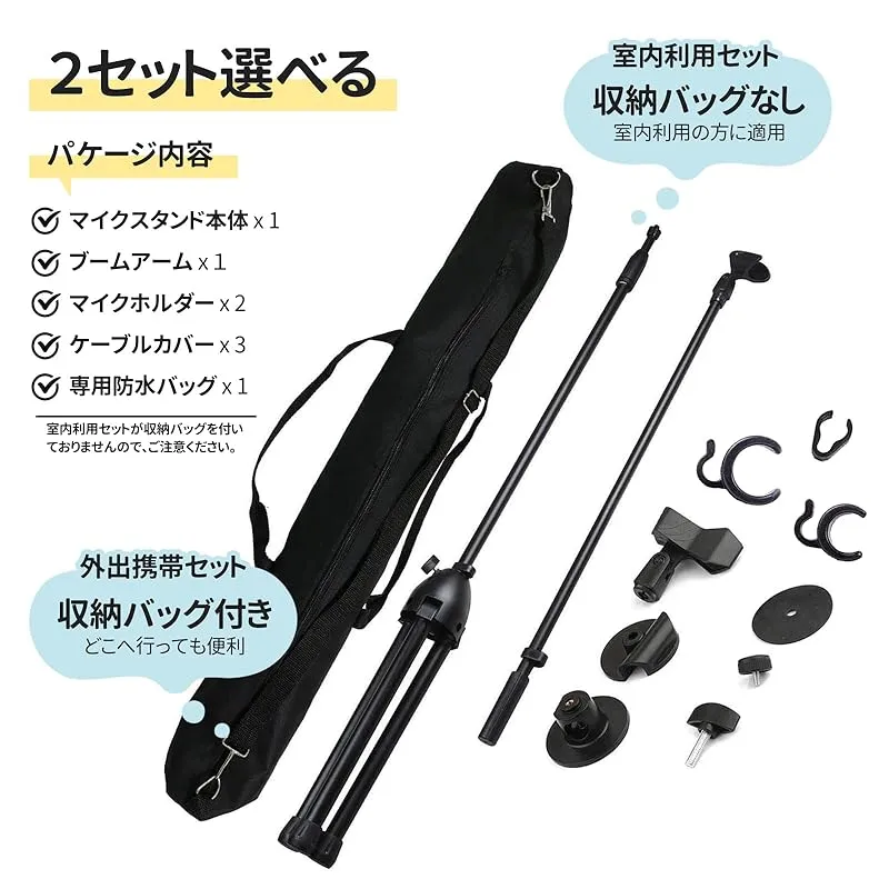 【収納バッグ付き・持ち運び便利】外出携帯セットは専用防水バッグ付きで、折り畳み式マイクスタンドは簡単に折り畳んで収納でき、どこへ行っても持ち運び便利です。マイクスタンドは約1.5kgの軽量で、女性一人もラクラクに持ち運びます。※持ち運ぶ必要がなく、長時間室内で利用する方は室内利用セットを購入するのもオススメです。