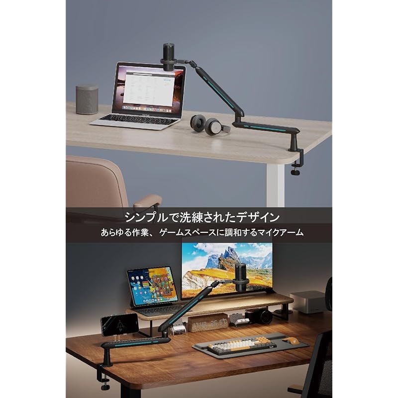 ケーブル収納:隠されたケーブルカバーがマイクアームに内蔵し、配線整理はより便利になります。ケーブルをきちんと整えられ、作業スペースの整理整頓に役立ち、見た目もすっきりとしています。
