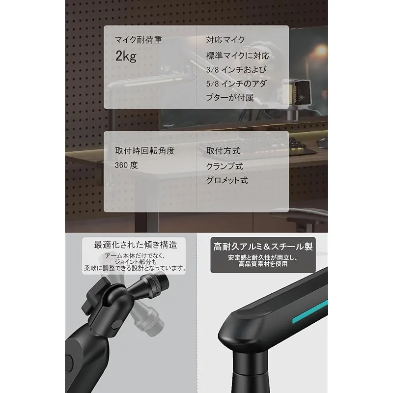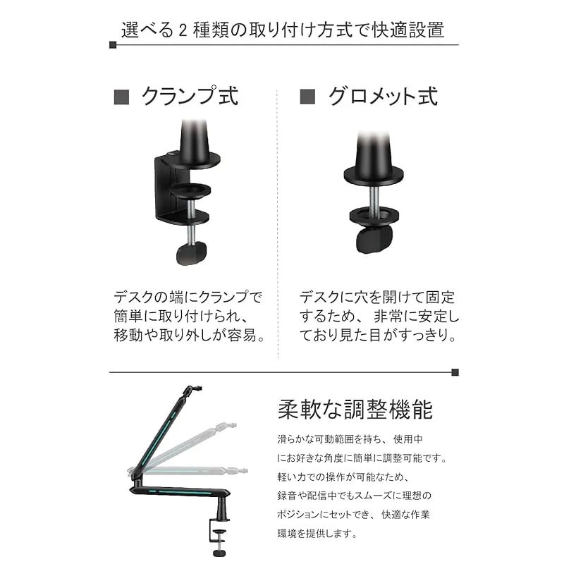 簡単な取り付け::クランプ式でデスクにしっかりと固定できるため、設置や取り外しが簡単で、場所も取りません。これにより、安定性を保ちながらマイクを使用できます。