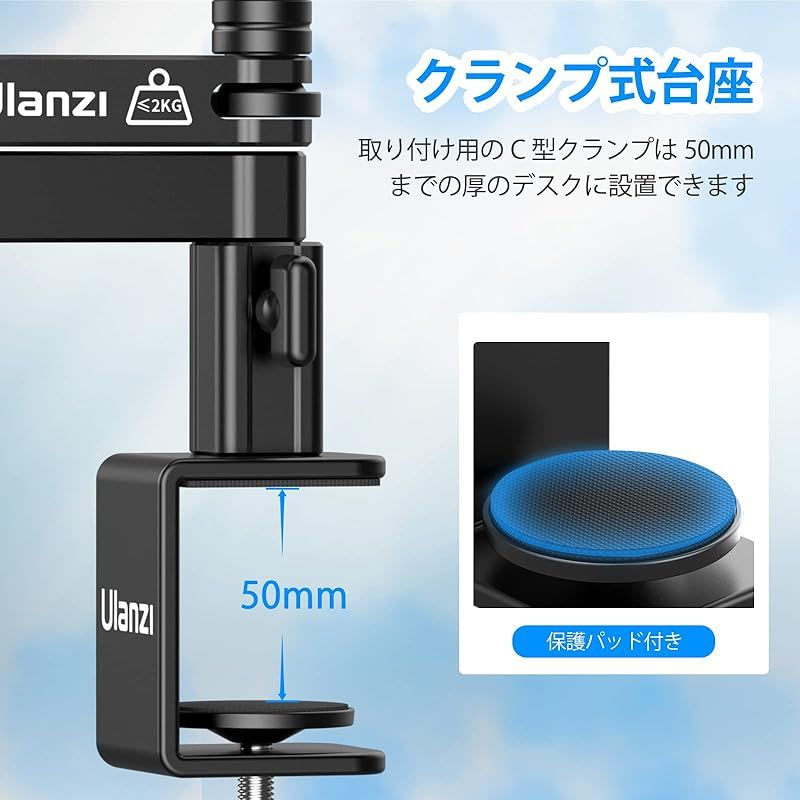 【クランプ式台座】取り付け用のC型クランプ50mmまでの厚のデスクに設置できます。頑丈に固定できるため、アームの位置調節の際に発生しがちな、ぐらつきや軋み音を軽減します。または保護パッド付きでクランプの取り付け部がキズ付くのを軽減します。マイクを傷から守るため、マイククリップはABS製で、サイズは100*45*26mmで、クランプ範囲は26-45mmです。