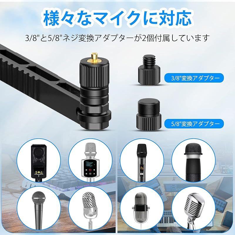 【様々な種類のマイクに対応】スタンド本体には1/4"ネジがあり、付属の3/8"と5/8"変換アダプターを使用することで様々なマイクが取り付けられます。ダイナミックマイク、コンデンサーマイク、無線カラオケマイクに適用。
