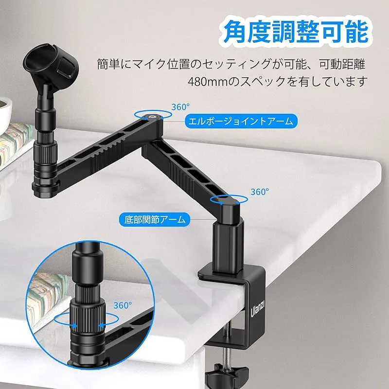 【角度調整】スプリングのないアーム式スタンドです。アームの長さは上部と下部が500mmで、可動距離480mmのスペックを有しています。マイクロホンアダプター、エルボージョイントアーム、底部関節アームの水平回転範囲は360°です。未使用時にはコンパクト折りたためるので、デスクのうえを広く使うことが可能。モニタースクリンの下部から伸び、見渡す限りのスペースを節約でき、低いところに作業可能。