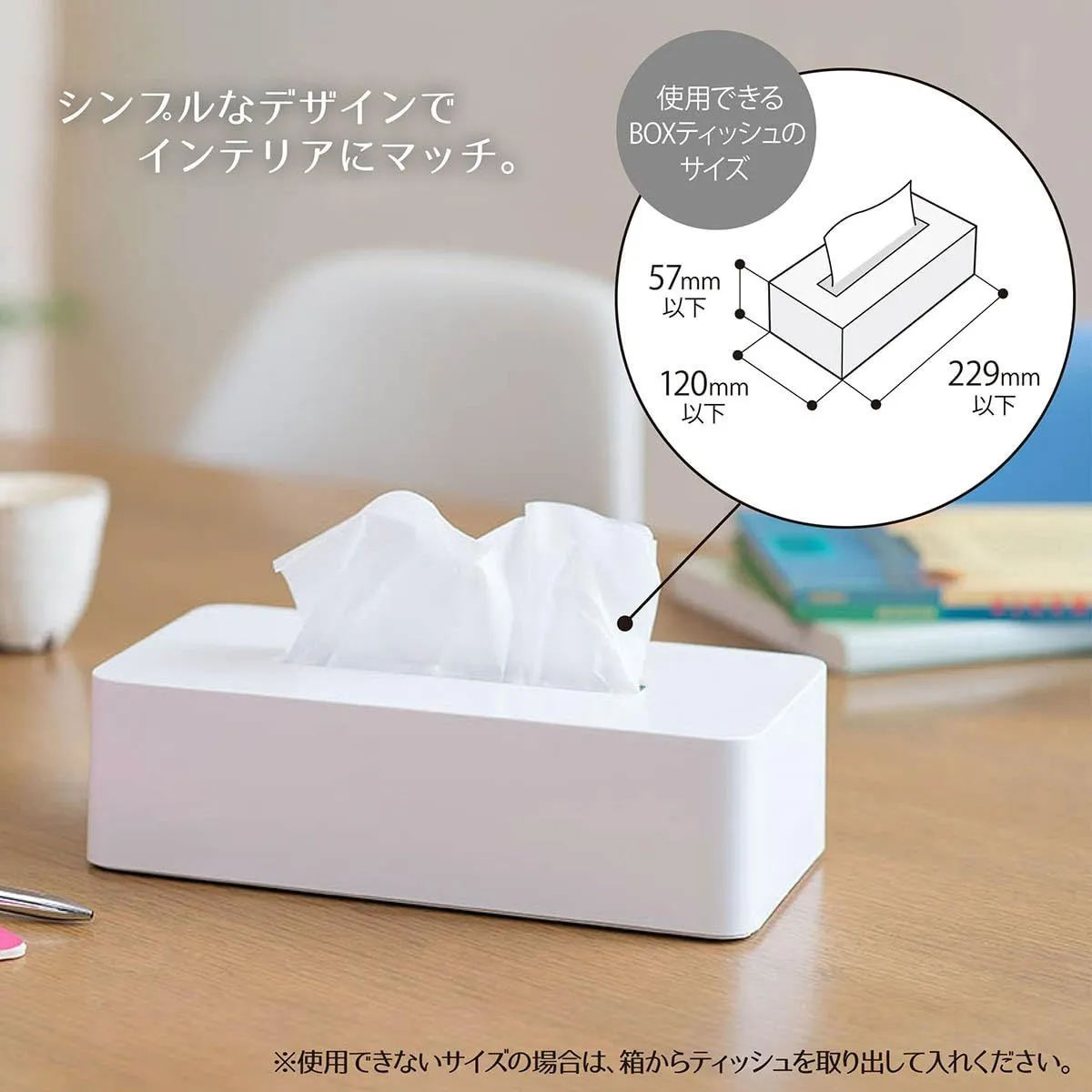 ・使用できるBOXティッシュのサイズ:幅229mm以下 奥行120mm以下 高さ57mm以下