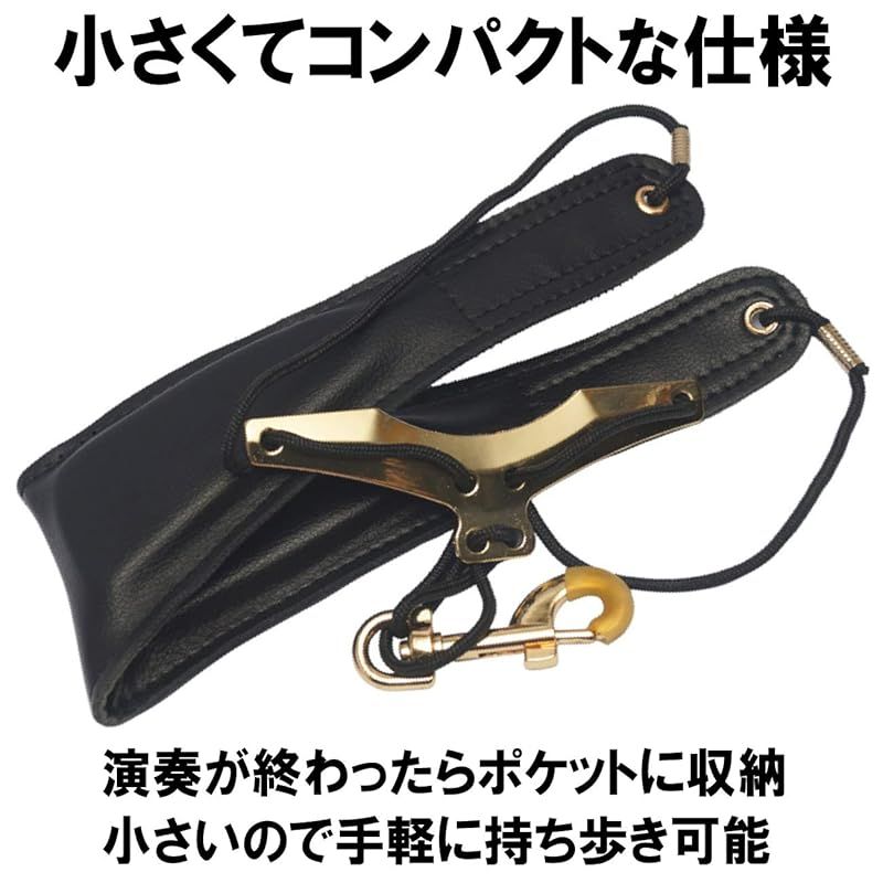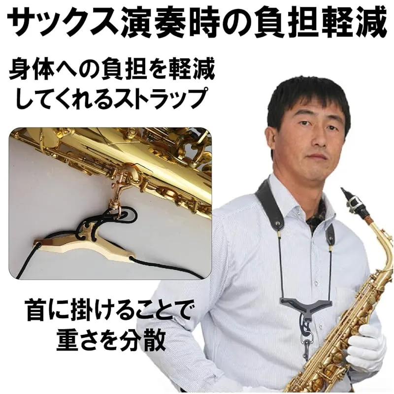 サックス演奏時の負担を軽く:重量のあるサックスを長時間演奏する際に身体に掛かる負担を軽くしてくれるストラップです。ストラップは首に掛けることにより重さを分散、演奏に集中できます。楽器への取り付けもフックを引っかけるだけ。さらに楽器に当たる部分にはゴムが巻いてあるので、楽器を傷つけることもない優れモノです。