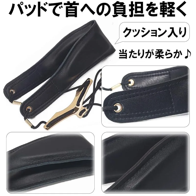 首への負担を軽くするクッションパッド付き:ストラップが首に当たる部分には幅広のパッドが付いています。パッドの中にはクッションが入っていますので、当たりが柔らか。楽器の重さで首が痛くなるのを減らすことができます。シンプルな作りなので演奏時の激しい動きも邪魔しません。