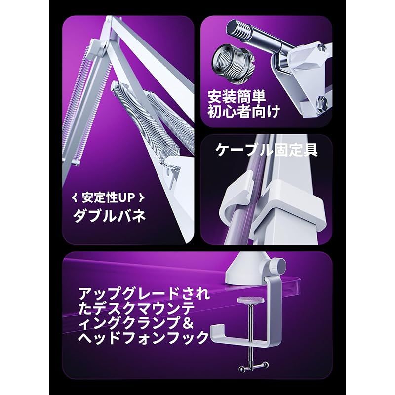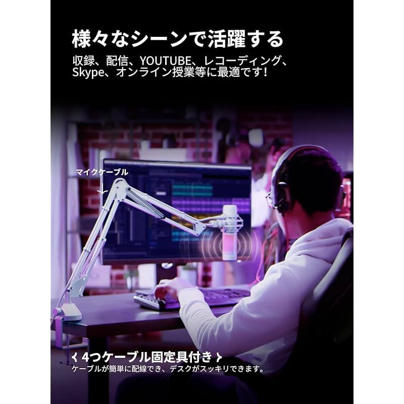 【完璧なマイクアームスタンド・耐荷重:1.8KG!】マイクブームアームスタンドはマイクがデスクに接していないため、キーボードの操作音や振動音を拾いにくいです。 浮かせて設置することでデスクまわりをフル活用できます。 省スペースと実用性アップ! 収録、動画配信、YOUTUBE生配信、レコーディング、Skype、オンライン授業、カラオケ、ギター、ドラム、ピアノ、宅録などに最適です。