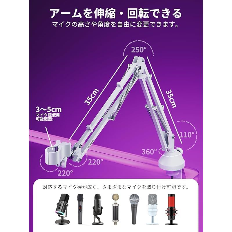 【アームを伸縮・回転できる、角度を自由に変更】上下移動の可動範囲も広い、使いやすいです! 回転角度 : アーム取付部:360°、マイクロホン取付部:220°、マイククリップ取付部:220°。上部アーム部:250°、下部アーム部:110°。 マイクを適切な角度や高さに簡単に調整して、完璧な音声を出すことができます。 マイクアームを使用しない時は折りたたんでおくことが可能になります。