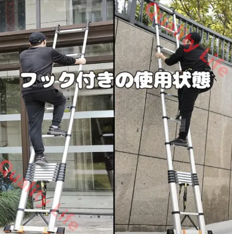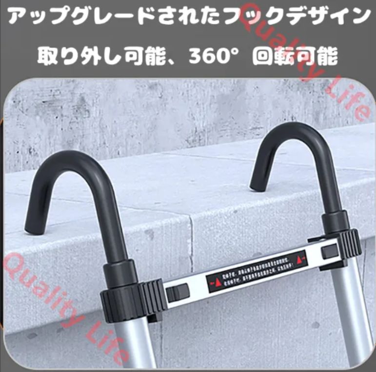 【多重安全保護設計、楽な操作】はしご 伸縮はしご 各はしごセクションには自動ロックシステムが装備されており、伸縮がしっかりと固定されます。底部には幅広の滑り止めフットパッドとクロスバーサポートが装備されており、地面のグリップを効果的に強化し、全体的な安定性を向上させます。トップフックの設計により、プラットフォームの端に寄りかかりやすくなるだけでなく、全体的な固定性も向上し、操作がより効率的かつ簡単になります。