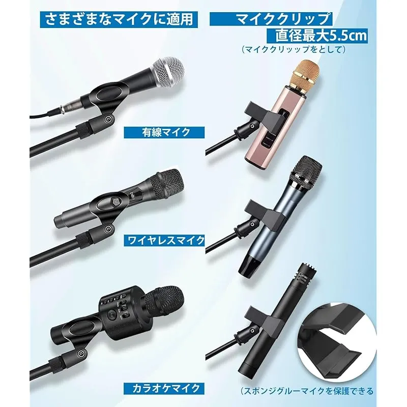 パッケージ内容:マイク三脚× 1 、マイクブームアーム× 1 、マイクホルダー× 2 、ケーブルクランプ二種× 2 、収納バッグ× 1 ;ほとんどのタイプのマイクに対応