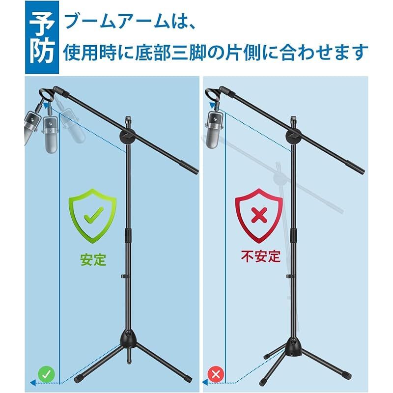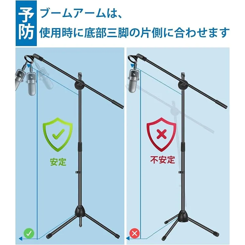 三本脚構造、安定:底部の三本脚スタンドは合金製で、強度と安定性に優れ、ステージ上での移動が簡単です(マイクは使用時、三脚スタンドの2本の脚の真ん中ではなく、どちらかの脚に合わせてください); 三脚スタンドにはゴム足が付属しており、フロアノイズを軽減し、安定性を高め、床を擦り傷から守ります