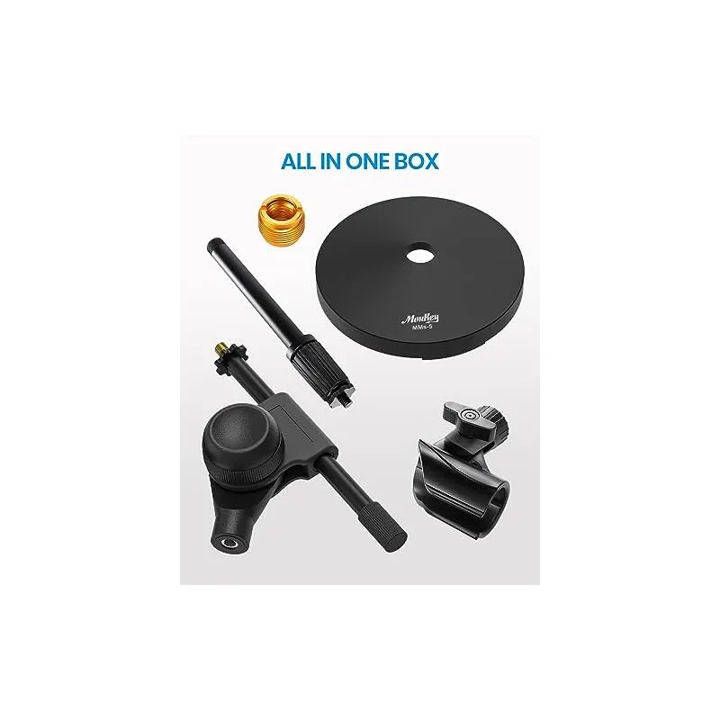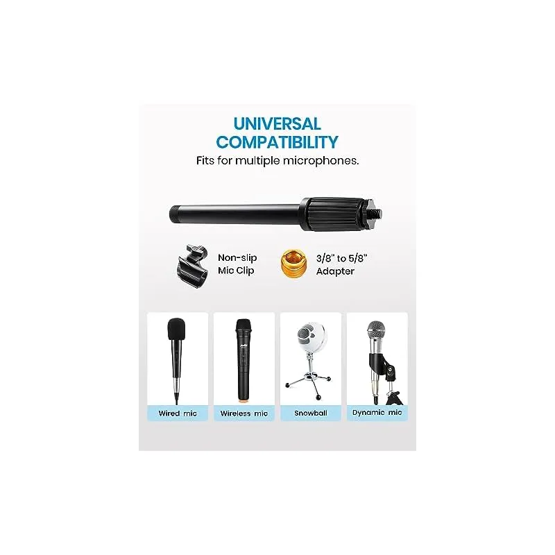 互換性 - マイクスタンドには滑り止めマイククリップと3/8から5/8の金属アダプターが付属しており、ほとんどのタイプのマイクに対応します。