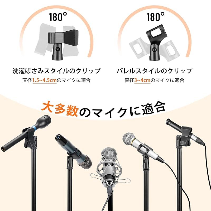 【パッケージの内容】このパッケージにはマイクスタンド×1、マイククリップ×2、ケーブルカバー×1、収納バッグ×1 があります。マイククリップが付いて好きなように置き換えて使えます。また、収納バッグは持ち運びバッグですので、どこへ行っても持ち運び便利です。