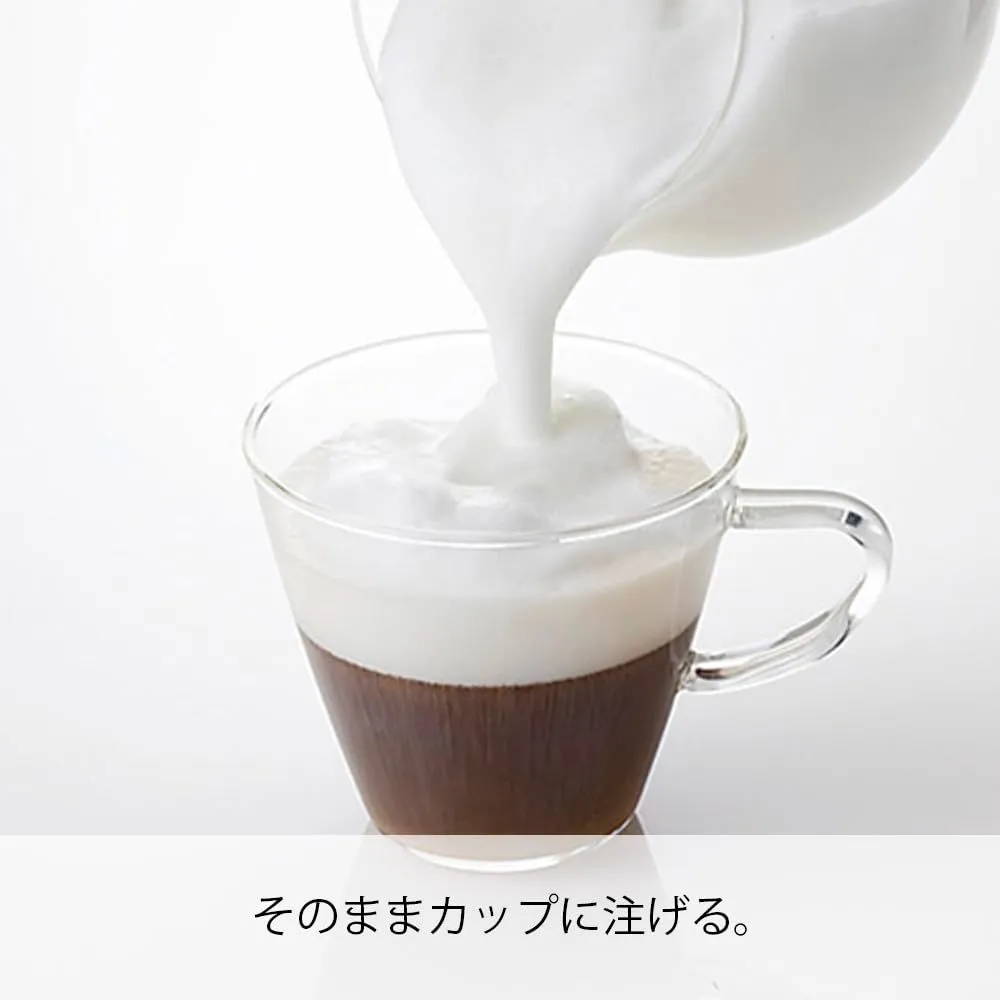 ふわふわの泡立ちミルクがご家庭で楽しめます。牛乳をポットにいれて電子レンジで温めます。その後スイッチを押し、30-40秒泡立てます。きめ細かくなめらかな泡立ちミルクの出来上がり。