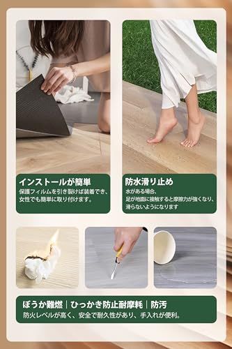 【賃貸/店舗/家庭に最適】21枚セットで約1畳カバー、42枚セットで/2畳カバー、賃貸救世主:剥がせば原状回復(※養生テープ使用時)。商用耐久仕様:オフィス・カフェの土足客動線に耐える耐摩耗層。床暖房対応:-2060熱変化で反りなし。デザイン統一:無規則柄で継ぎ目目立たず(追加購入時も色差最小化)。