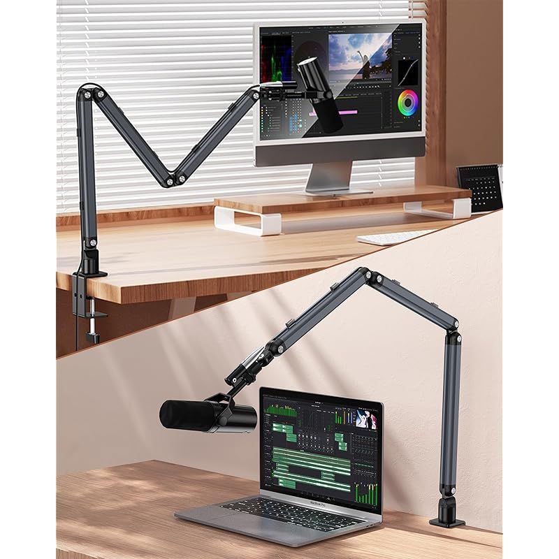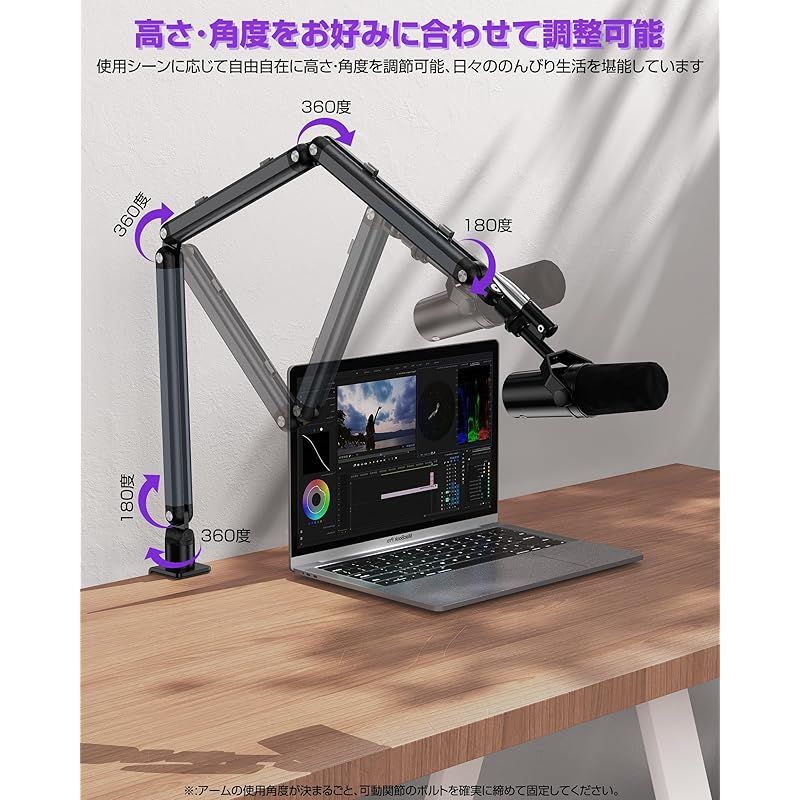 【マイクアーム・幅広い可動域】本製品は八つ可動関節を備えており、高さや角度を自由自在に調節できるマークアームです。幅広い可動域で、作業内容に合わせてマイクの位置を自由に調整し、使いやすい位置で持っていけます。または、折り畳み式で、折り畳めば場所を取らない、使う時は手元まで伸ばすことができ、空間を有効に活用できます。なお、マイクを好適な位置で長時間に保持でき、配信/収録用/生放送実況に大活躍です。