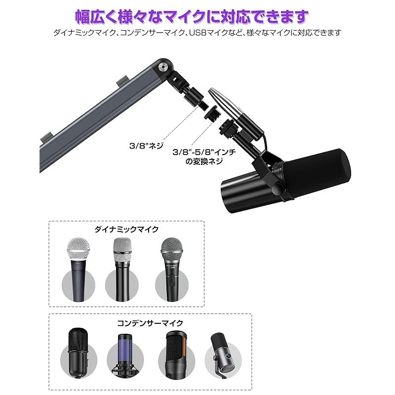 【幅広くマイクが対応】3/8"-5/8"インチの変換ネジとマイククリップがセットされており、ダイナミックマイク、コンデンサーマイク、USBマイクなど、様々なマイクに対応できます。それにも、マイククリップの直径は3?5cmで、サイズに合うマイクを差し込んで取り付けでき、すぐに利用できます。(※:アームの使用角度を決まったら、各可動関節のボルトを確実に締めてください。)