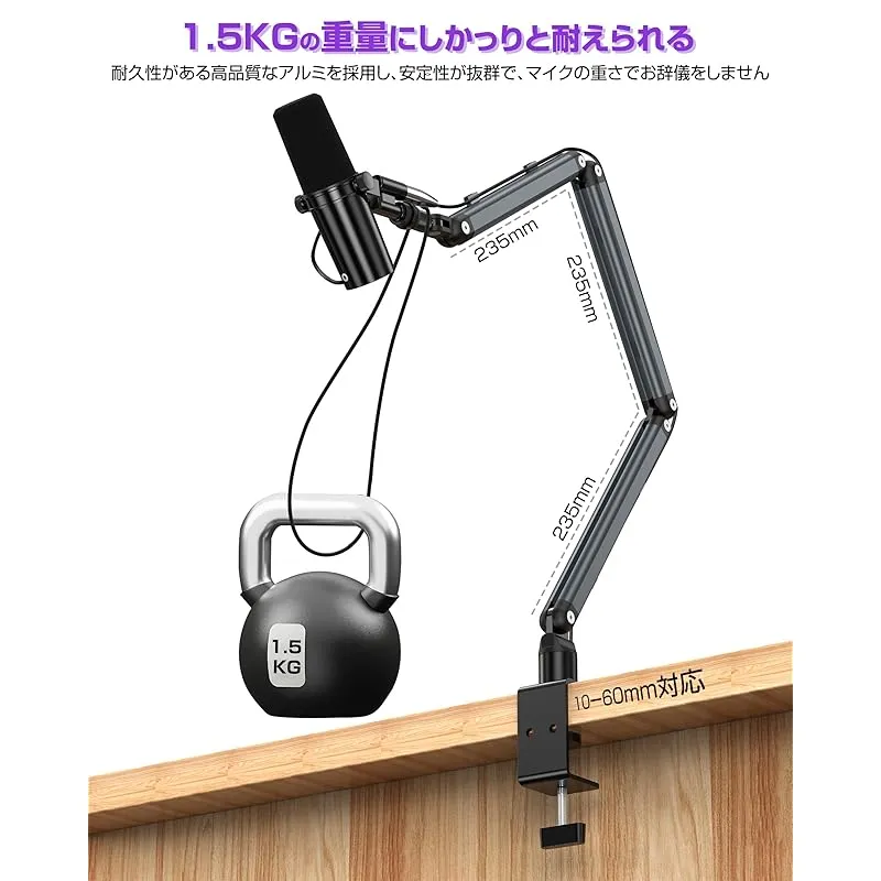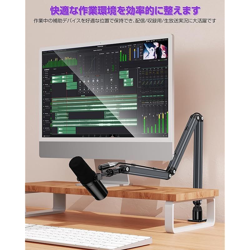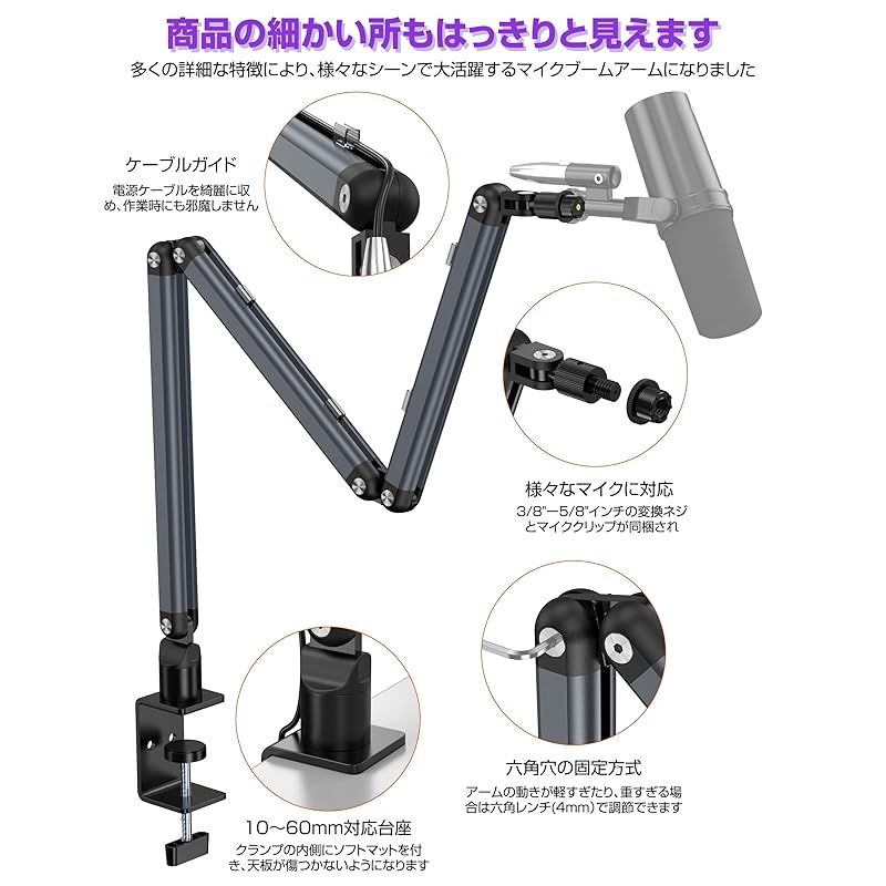 商品名:マイクブームアーム マイクスタンド コンデンサーマイク用 アルミ製 耐荷重1.5KG 八つ可動関節 広い可動域 角度調節可能 折りたたみ 省ベース ケーブルガイド マイククリップ付属 収納便利 配信/収録用/生放送実況