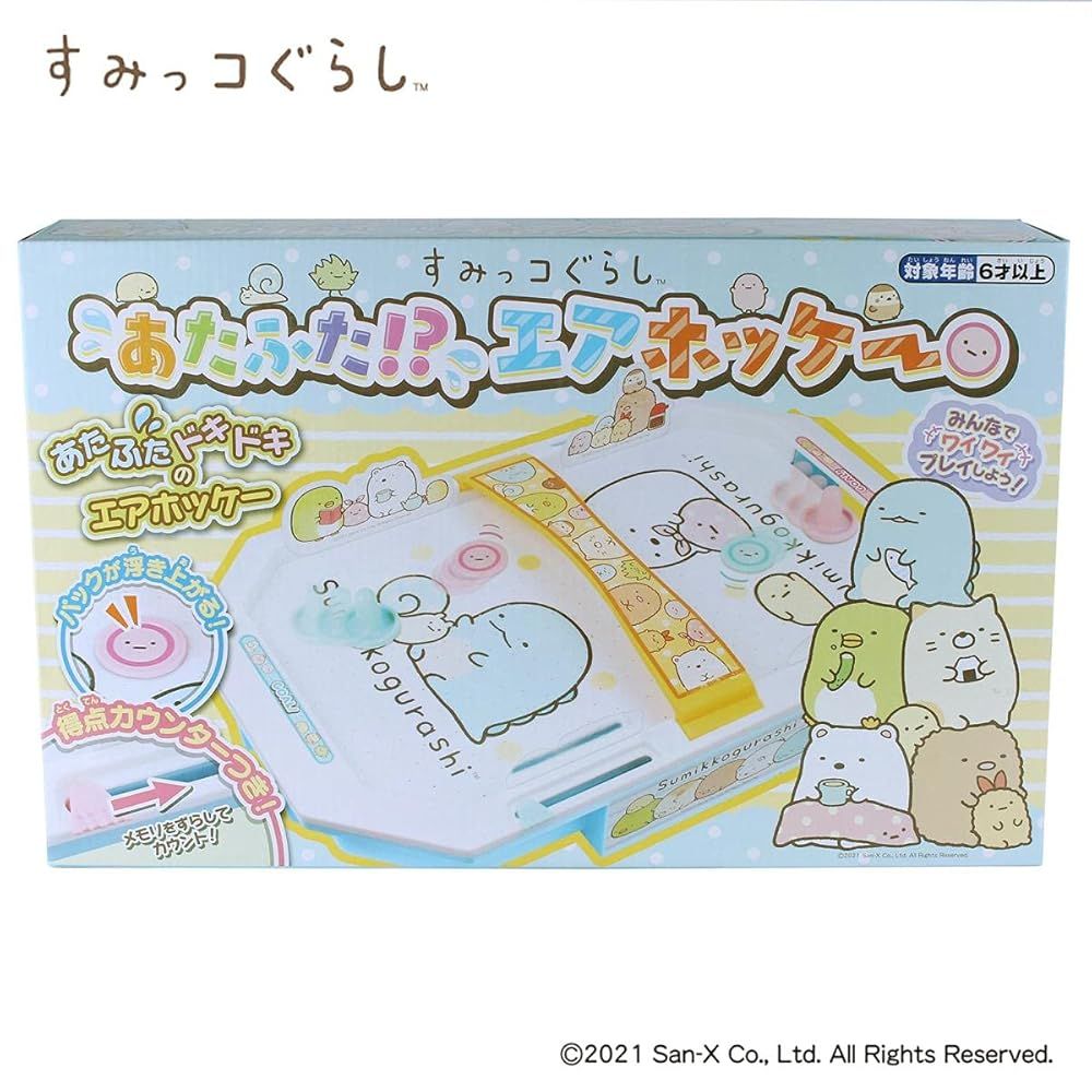 「商品状態」11「商品情報 (新品の場合) 」. 「主な仕様」すみっコぐらしのデザインがかわいいエアホッケーです。家族やお友達と一緒に点数を競って遊んでね! 対象年齢:6歳以上 単1電池2本使用(別売) パッケージサイズ:幅430×高さ270×奥行85(mm) (C)2021 San-X Co.Ltd.All Rights Reserved.