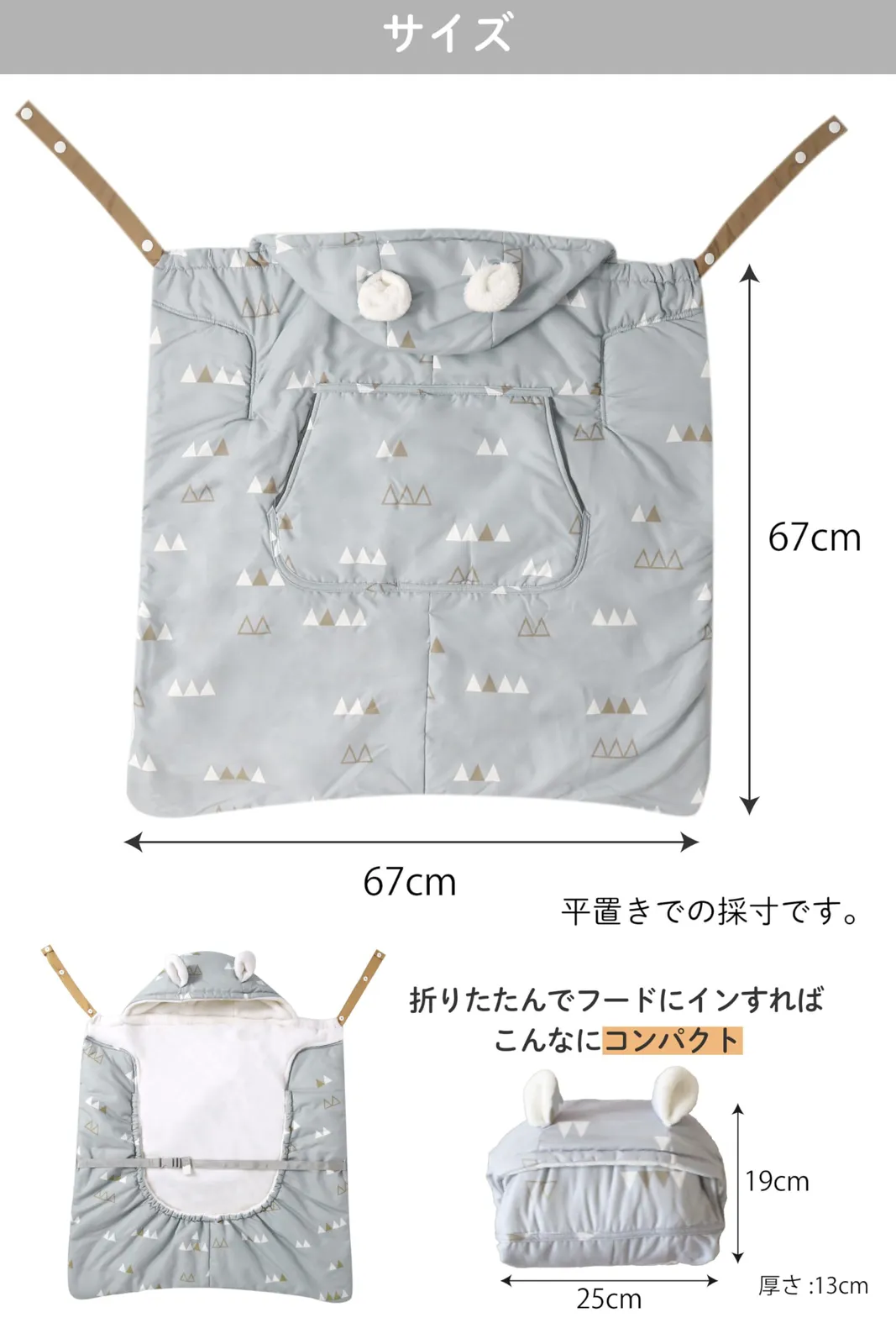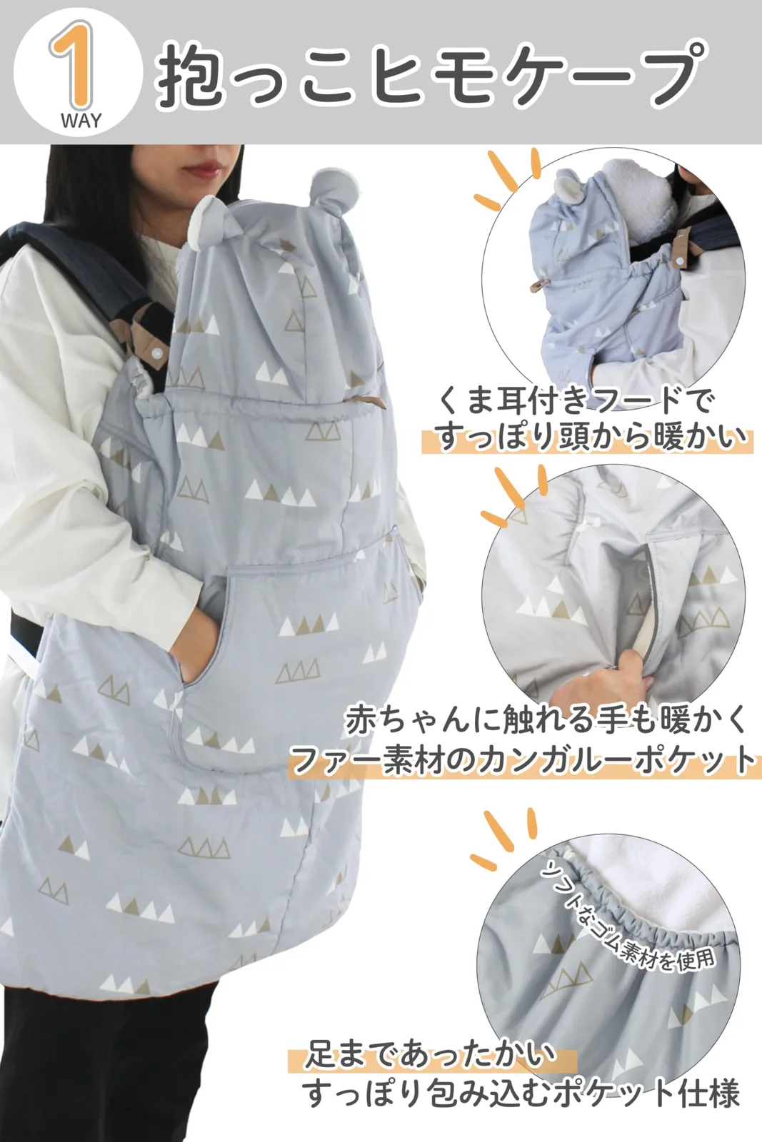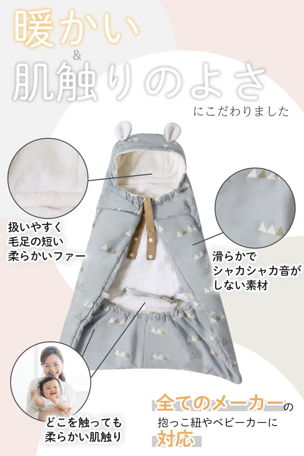 [あったかくて優しい素材の3WAYベビーマルチブランケット]抱っこ紐ケープ、ベビーカーブランケット、おんぶケープの3WAY仕様。用途に合わせた使い方で、寒い日も暖かく快適にお出かけできるベビーマルチブランケットです。頭から足元まで赤ちゃんをスッポリ覆えて暖かい!柔らかく乾燥しにくいファー素材を厳選し、外側生地も滑らかで手触りのいい生地を採用しました。どこを触っても柔らかく優しく抱っこ紐ケープです。内側には扱いやすい毛足の短めのファーを絡まりにくく毛玉のできにくい生地を採用しました。外側は滑らかでシャカシャカ音がしない素材なので赤ちゃんが寝てしまっても静かにおやすみできる抱っこ紐ケープが出来上がりました。軽量なので着けていてもノンストレス&使わない時の持ち運びも楽々できます。抱っこ紐ケープとして使用する時に、ご使用する方の手元も温めるポケット付きです。 赤ちゃんに触れる手も暖かく、スマホやカイロを入れることもできます。寒い日のお出かけも楽しく快適にお過ごしいただけるようなベビーブランケットをぜひお試しください。