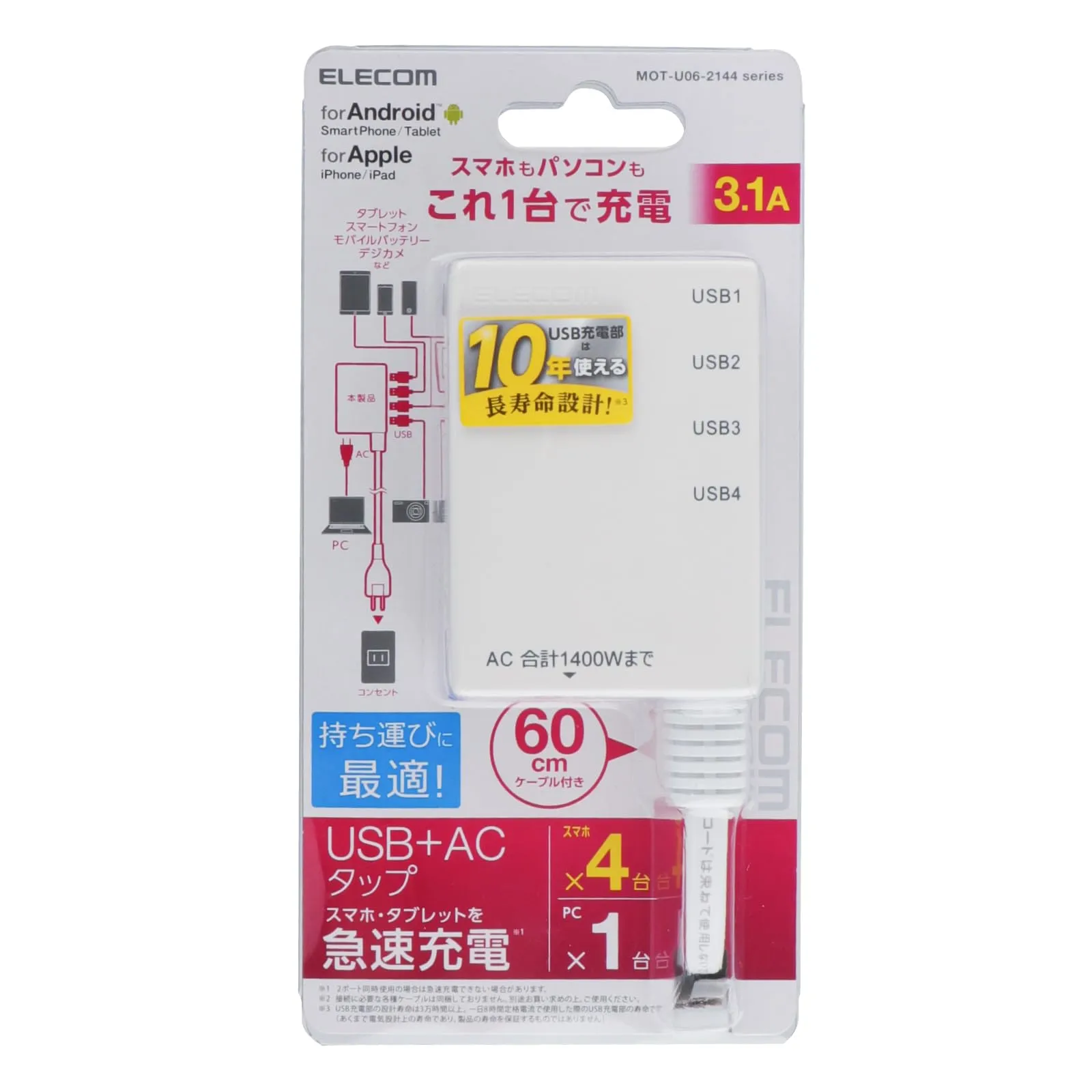 コンセントから離れた場所でも充電できる長さ60cmのコード付きタイプです