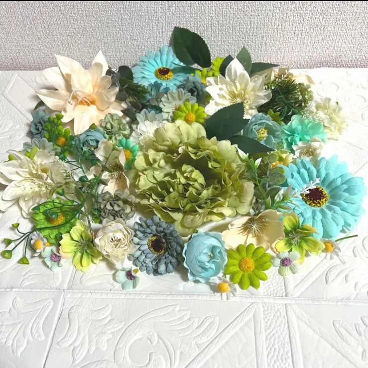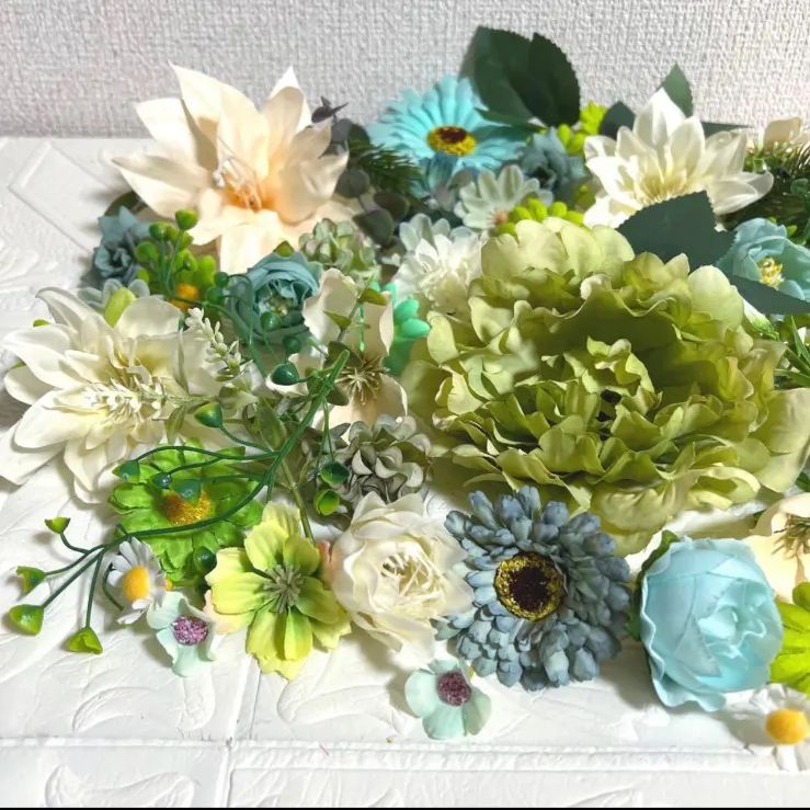 グリーンとクリームでアレンジしました♪ フェイクグリーンや葉っぱもセットになっています。